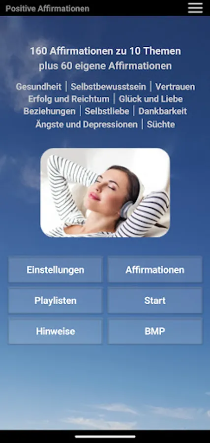 160 of the most popular and effective affirmations on 10 topics are spoken in this app. In the beginning you should only start with a few affirmations. These should be used several times a day if possible.