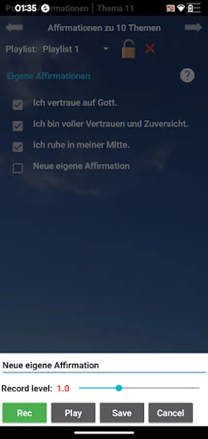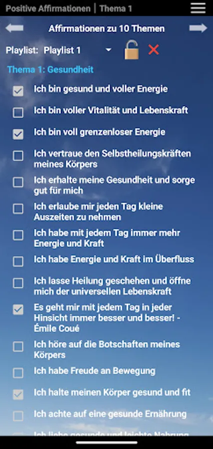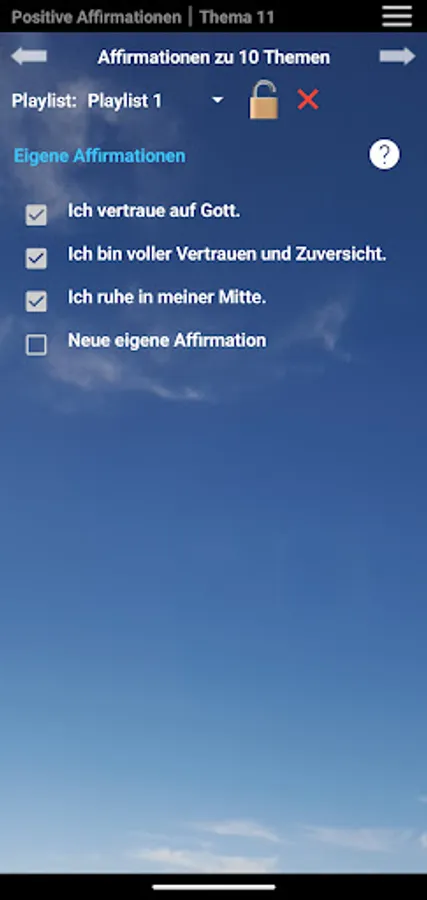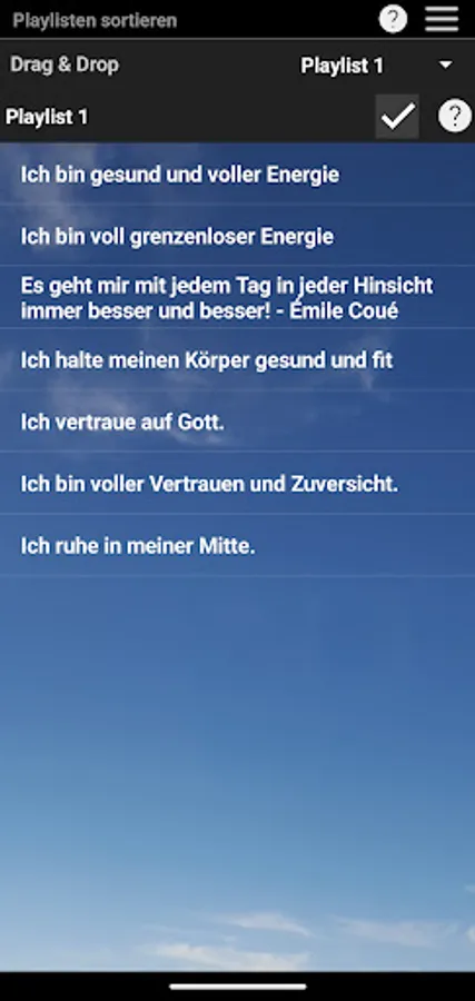 Up to 8 different playlists can be saved. In addition, the order of the affirmations can be adjusted as required.
