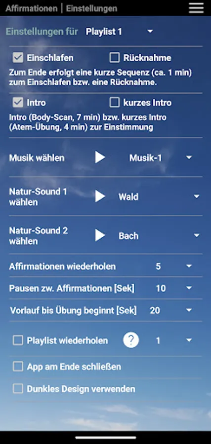 The number of repetitions can be set between 1-25 times. In addition, the length of the pause between the affirmations can be set from 5-30 seconds.