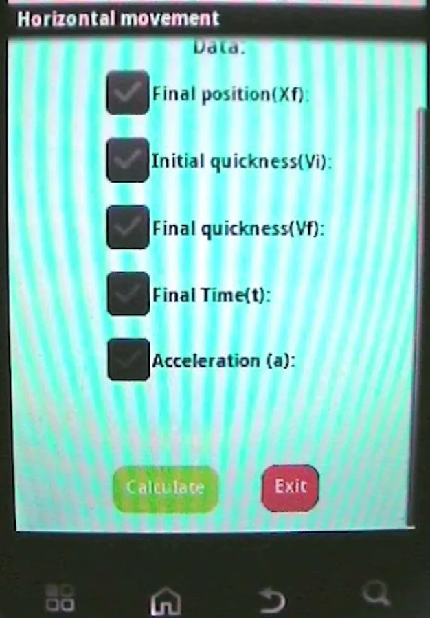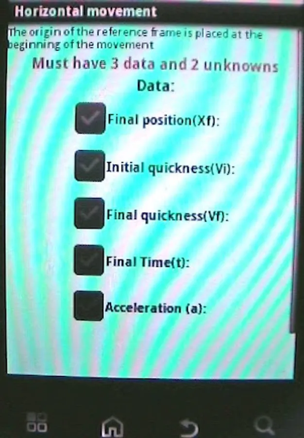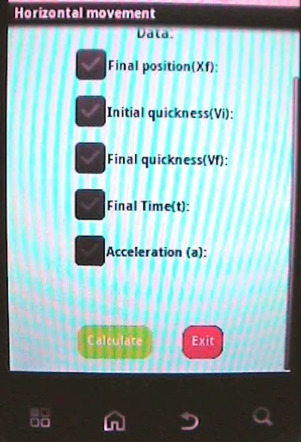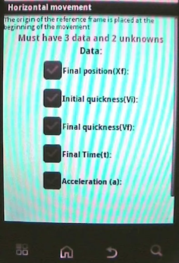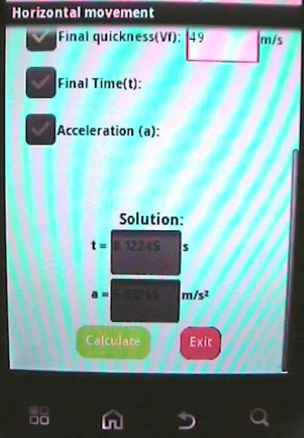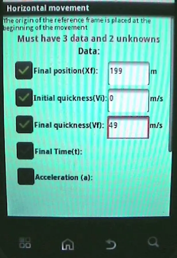 With this application you can calculate the value of the final variables with the value of the initial conditions, it is about the theme of horizontal movement of kinematics. Using the basic equations: Xf = Xi + Vi * t + (1/2) * ax * t² and Vf = Vi + ax * t. It can not be applied to all cases.