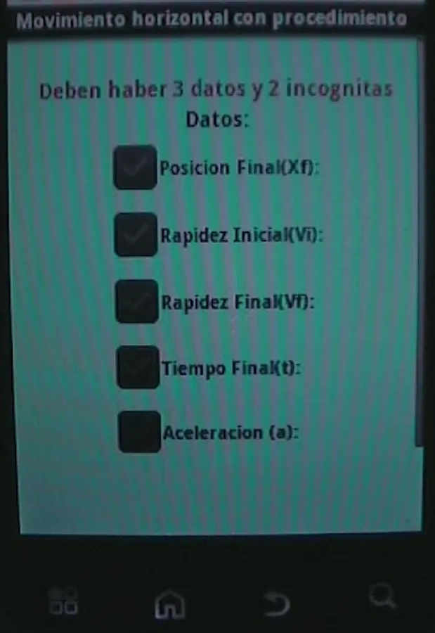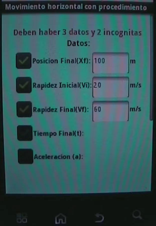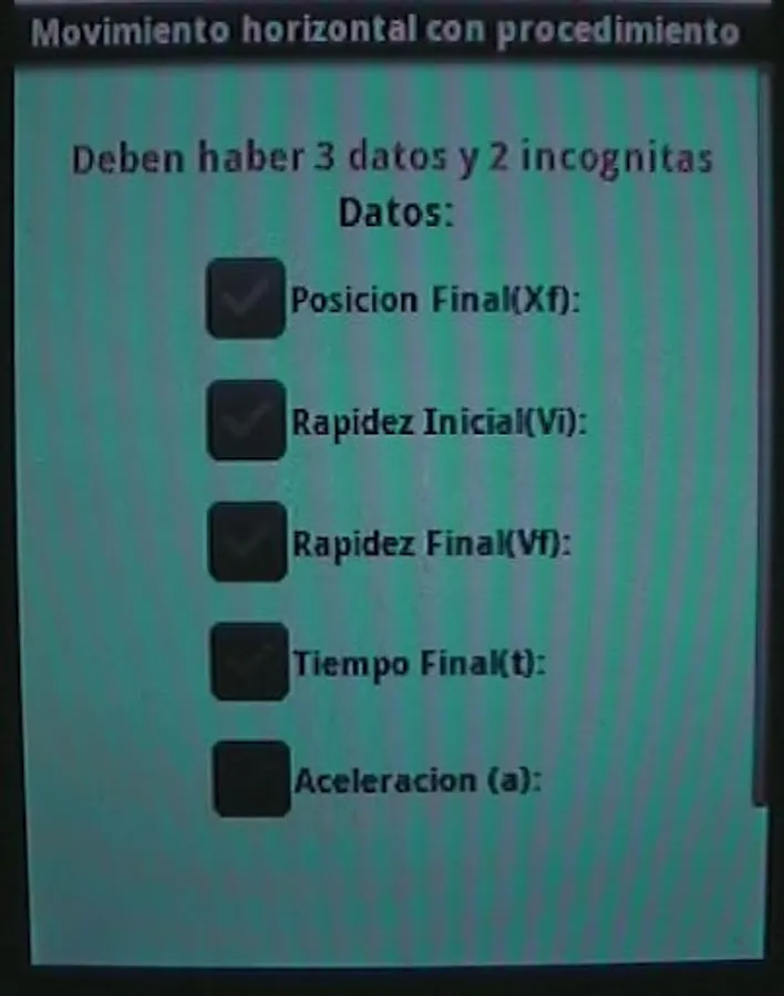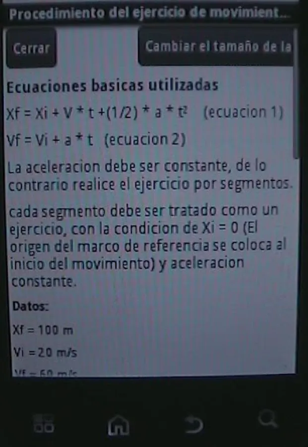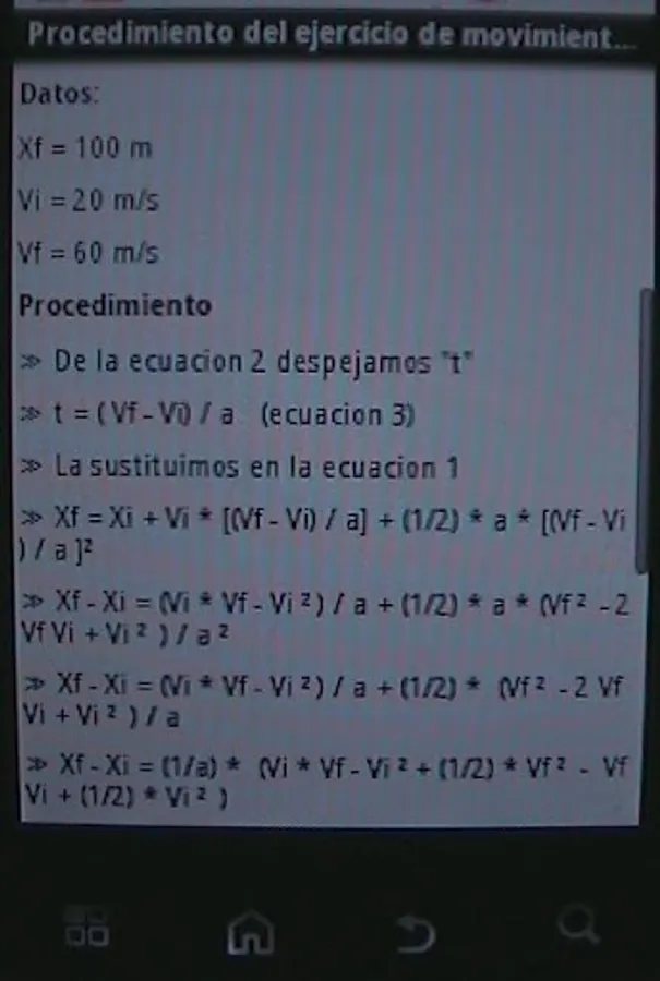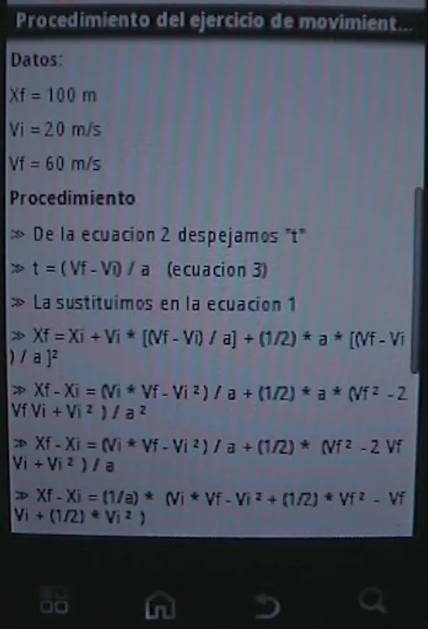 With this application you can solve numerically some exercises of horizontal movement, theme of kinematics, in addition you can visualize the procedure used for the resolution. The basic equations of the subject are used for this, Xf = Xi + Vi * t + (1/2) * ax * t² and Vf = Vi + ax * t. It is only applicable to a certain number of cases.
