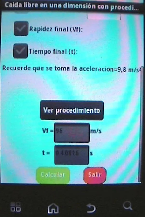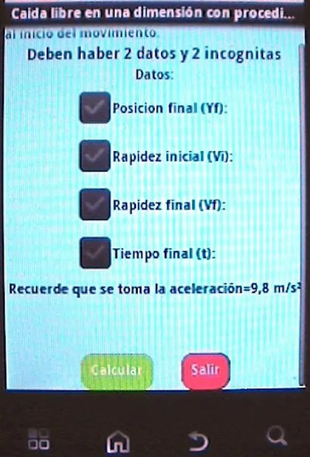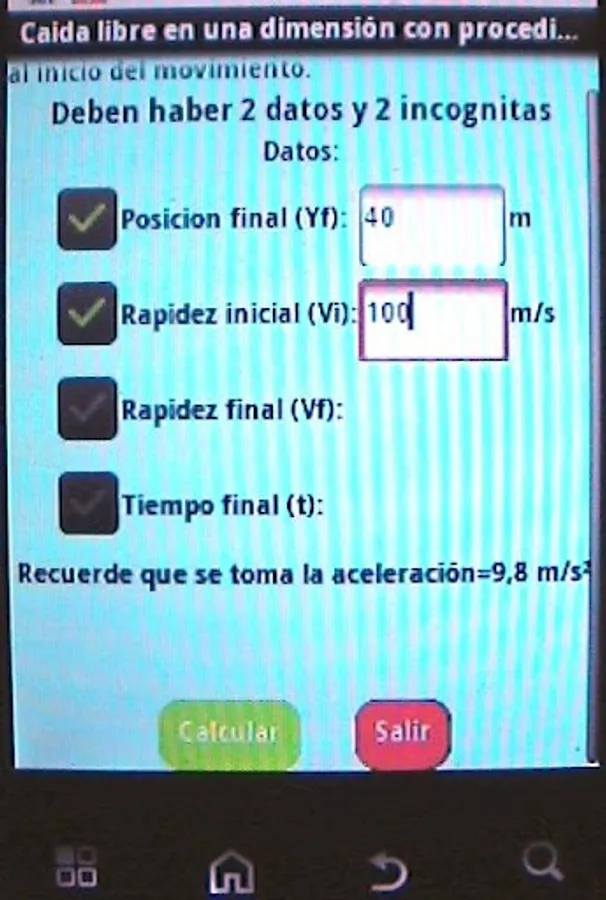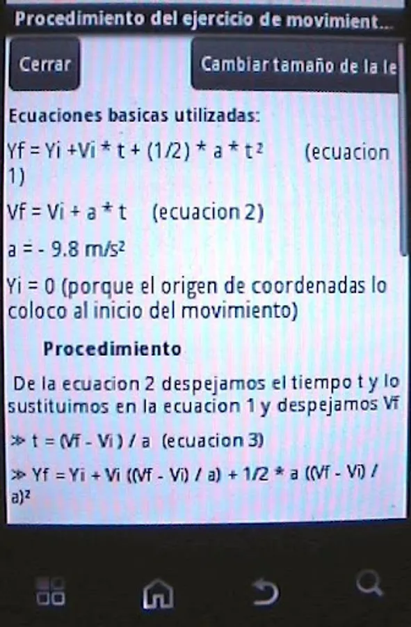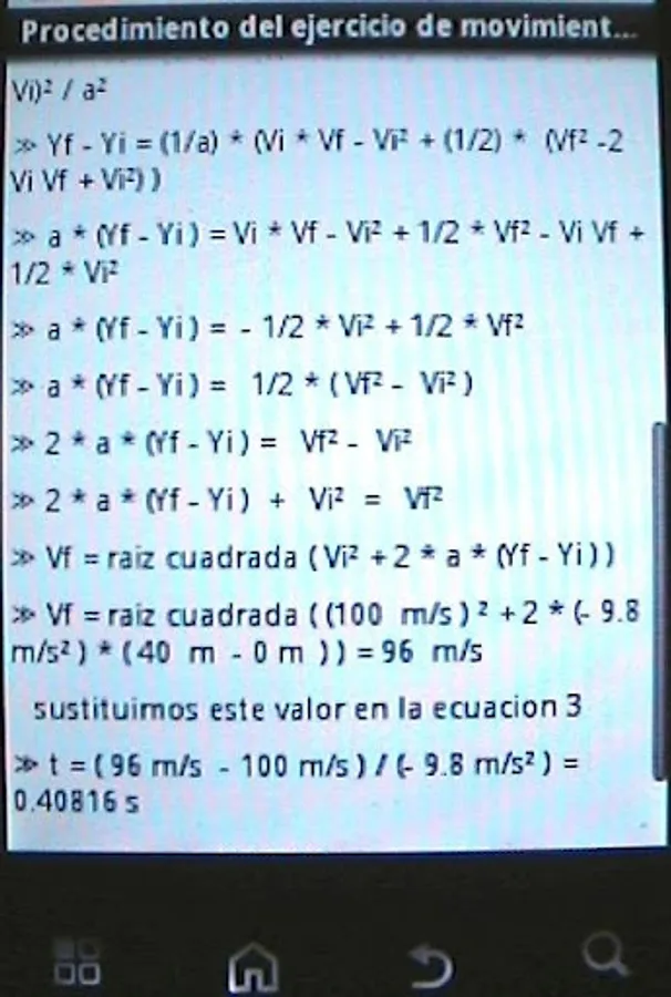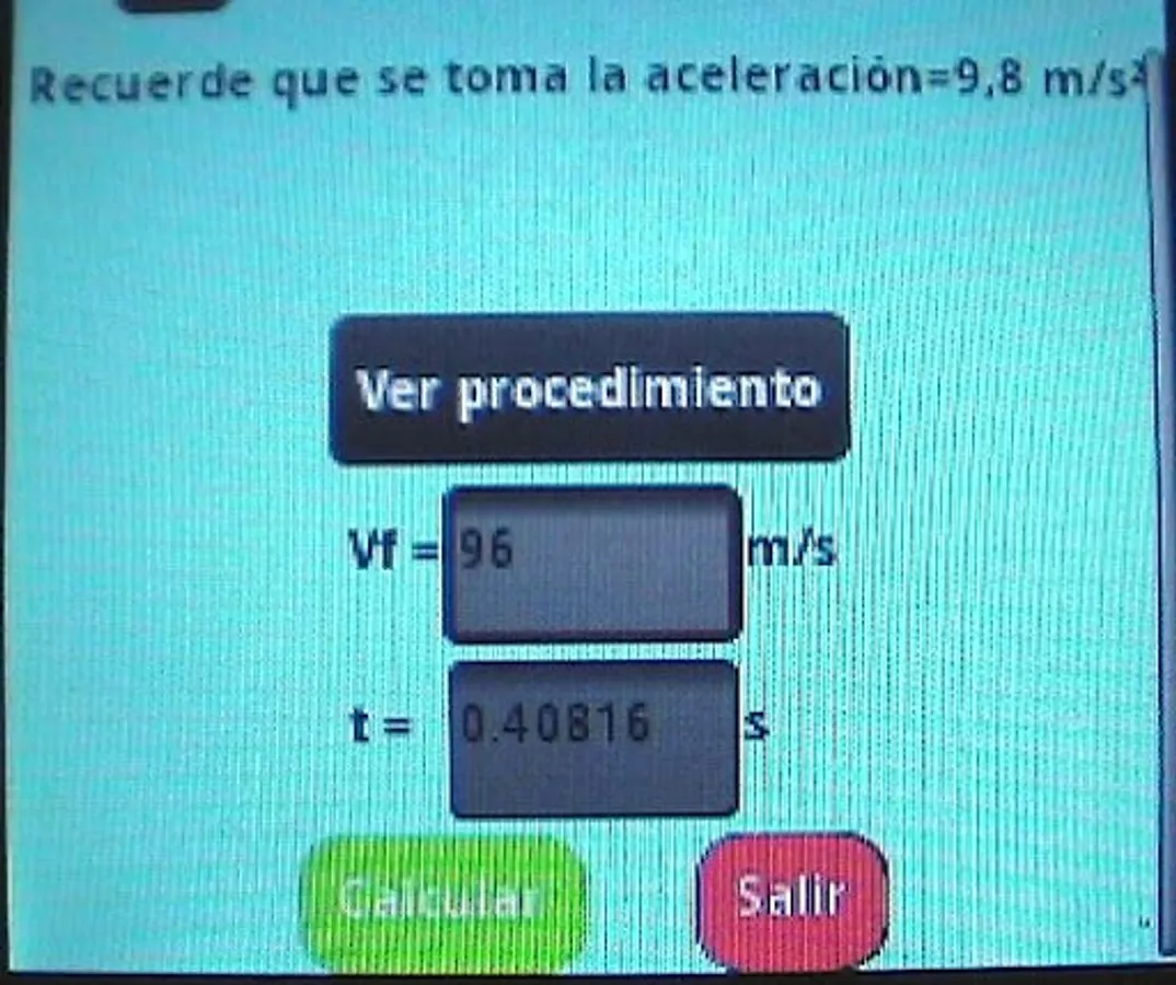 With this application you can solve numerically some exercises of vertical movement, theme of kinematics, you can also visualize the procedure used for the resolution. The basic equations of the subject are used for this, Yf = Yi + Vi * t + (1/2) * g * t² and Vf = Vi + g * t. It is only applicable to a certain number of cases.