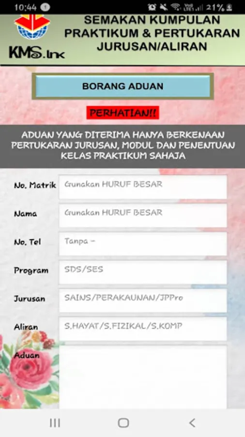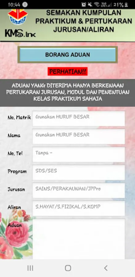 Aplikasi ini adalah untuk Proses menyemak kelas tutor, pertukaran jurusan dan aliran serta untuk membuat aduan mengenai semua proses tersebut