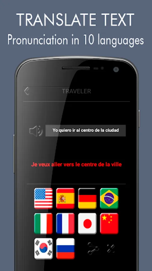 TRAVELER is an intelligent translator on your device with which you will be able to maintain fluid dialogues without pauses in 10 languages. Very easy to use thanks to its simple design: WITH 2 BUTTONS YOU CAN HAVE FLUID CONVERSATION IN TEN LANGUAGES. Ideal for two-way conversations.