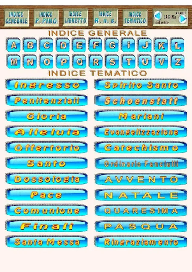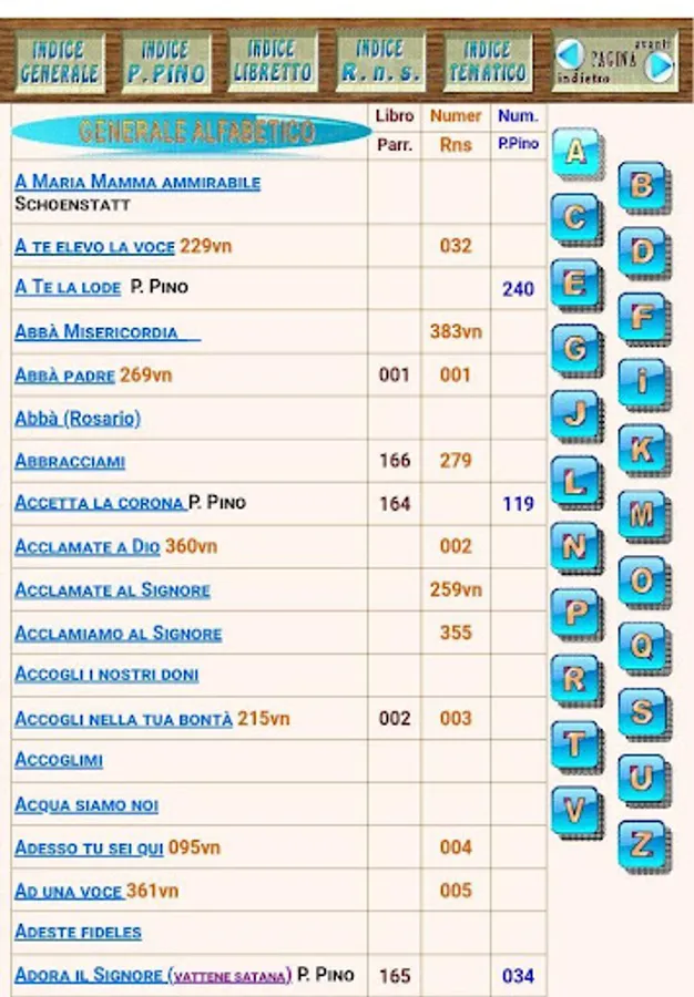 - Songs with Gen, Schoenstatt, P. Marco Frisina, P. Marcello Rossi, P. Pino Spataro, Medjugorje, Christmas, Pasquali, Radio Maria, Kiko, Giombini, Meloni, Sequeri, Scaglianti, Lourdes, Cosquio, Buttazzo, Canoni di Taizè, Father Giuseppe Di Fatta, Father Giosi Cento, Chieffo, Semprini, RNS,