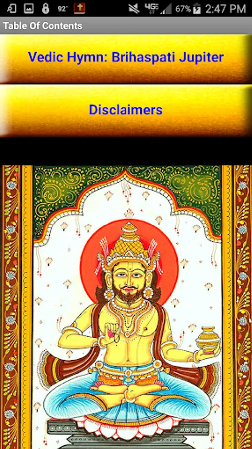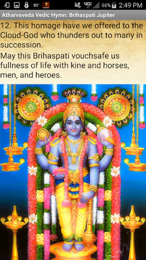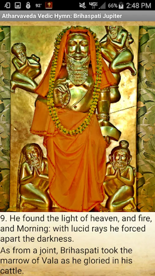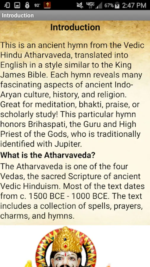 This app contains an ancient hymn from the Vedic Hindu Atharvaveda, translated into English in a style similar to the King James Bible. Each hymn reveals many fascinating aspects of ancient Indo-Aryan culture, history, and religion. Great for meditation, bhakti, praise, or scholarly study! This particular hymn honors Brihaspati, the Guru and High Priest of the Gods, who is traditionally identified with Jupiter.