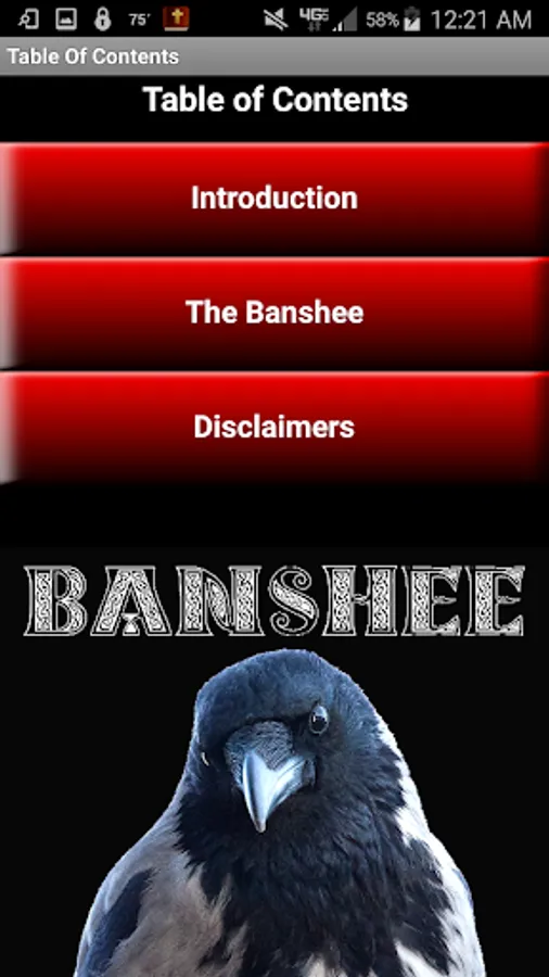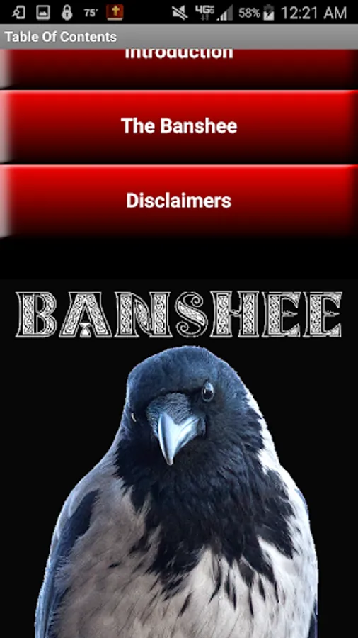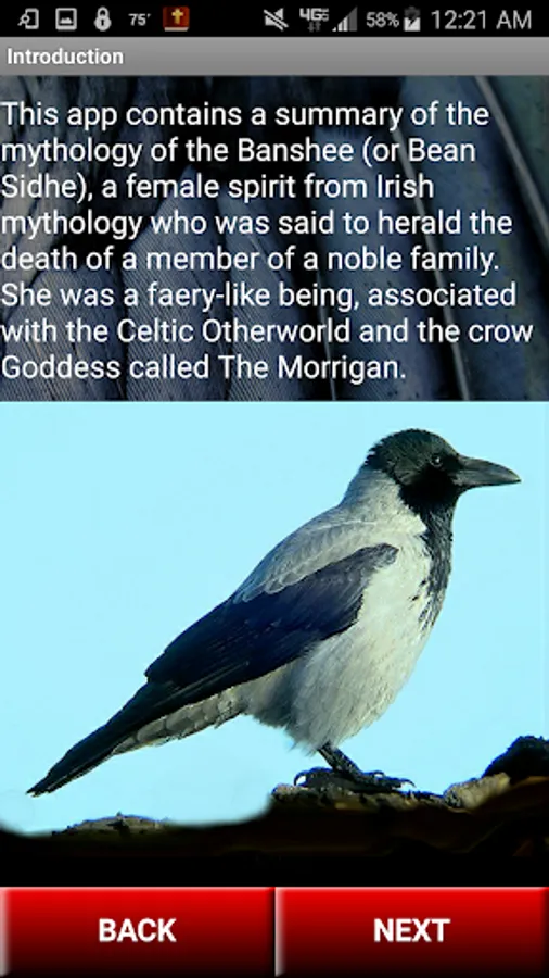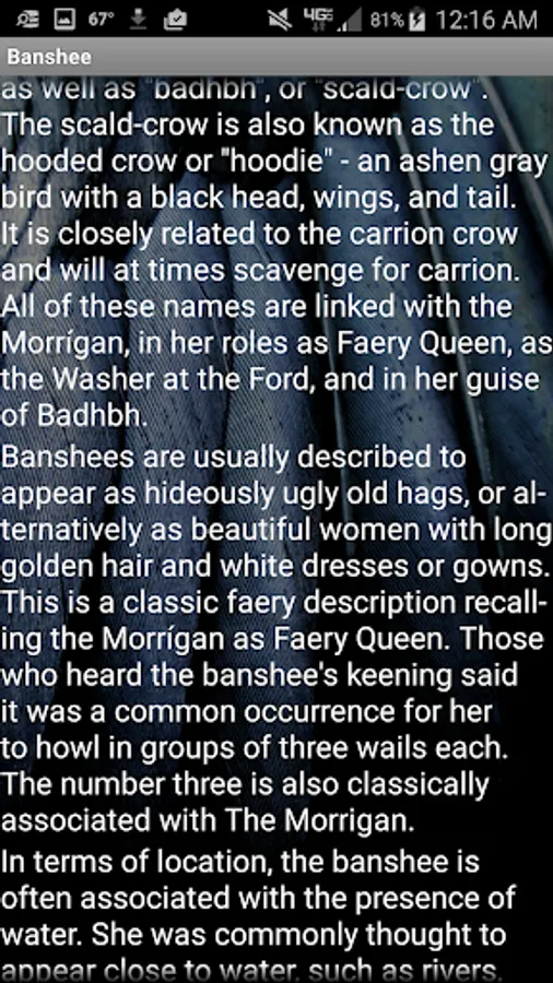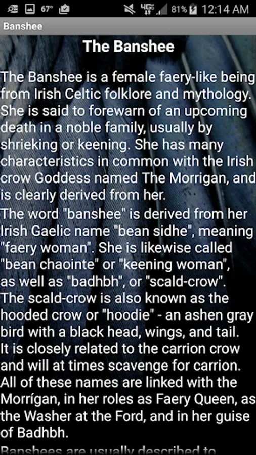 This app contains a summary of the mythology of the Banshee (or Bean Sidhe), a female spirit from Irish mythology who was said to herald the death of a member of a noble family. She was a faery-like being, associated with the Celtic Otherworld and the crow Goddess called The Morrigan.
