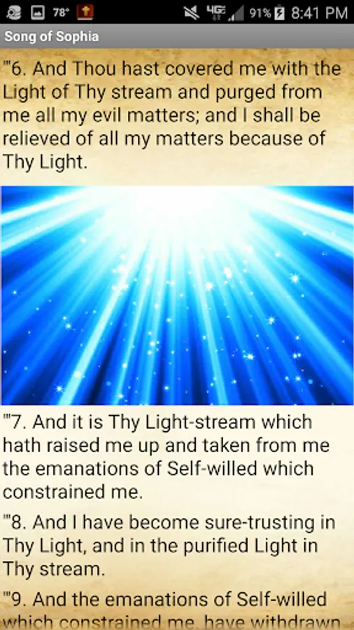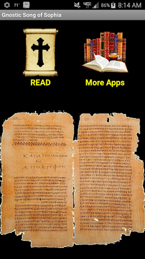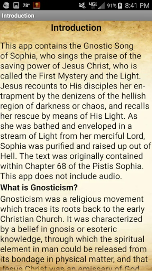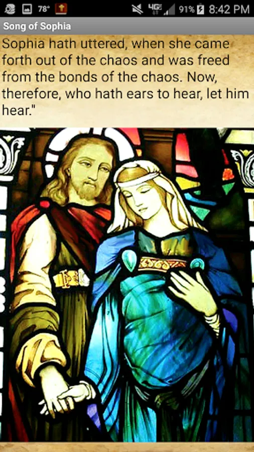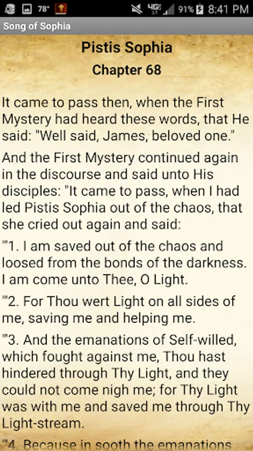 This app contains the Gnostic Song of Sophia, who sings the praise of the saving power of Jesus Christ, who is called the First Mystery and the Light. Jesus recounts to His disciples her entrapment by the denizens of the hellish region of darkness or chaos, and recalls her rescue by means of His Light. As she was bathed and enveloped in a stream of Light from her merciful Lord, Sophia was purified and raised up out of Hell. The text was originally contained within Chapter 68 of the Pistis Sophia. This app does not include audio.