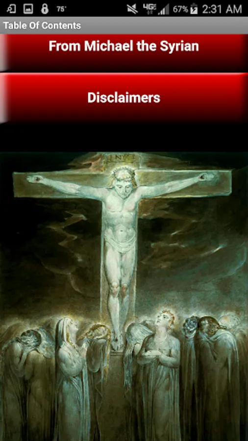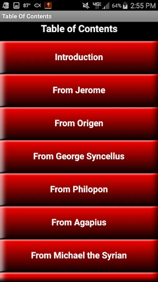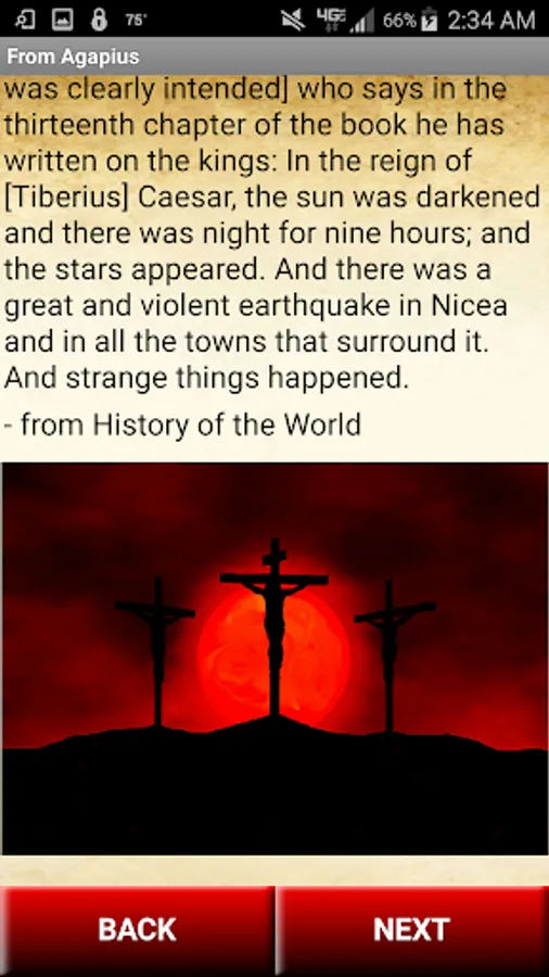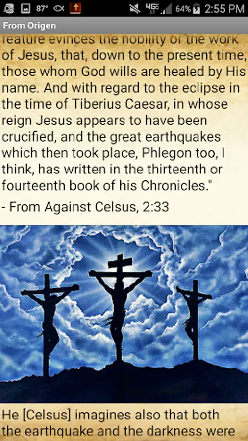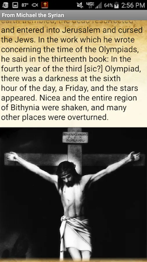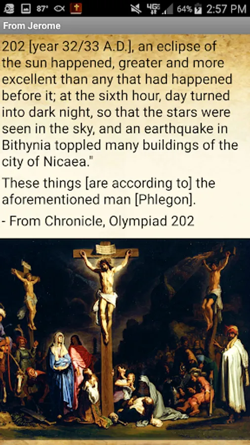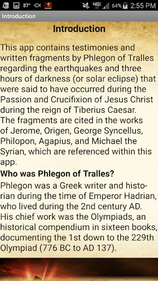 This app contains testimonies and written fragments by Phlegon of Tralles regarding the earthquakes and three hours of darkness (or solar eclipse) that were said to have occurred during the Passion and Crucifixion of Jesus Christ during the reign of Tiberius Caesar. The fragments are cited in the works of Jerome, Origen, George Syncellus, Philopon, Agapius, and Michael the Syrian, which are referenced within this app.