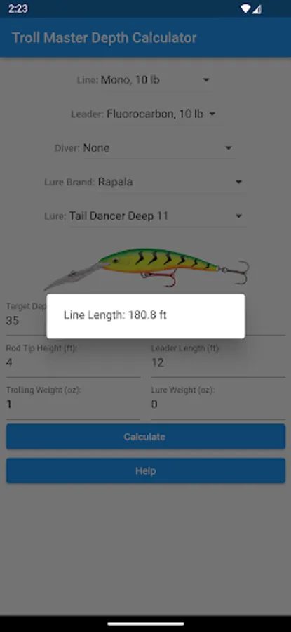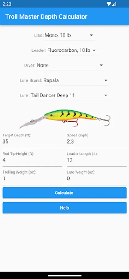 The most comprehensive trolling app on the market! Use it on the water to calculate your depth or use it at home to construct your own dive charts. This app lets you select your line, your lure, a diver or trolling weights, and then combine them however you want. Quickly and easily see the effect of changing line length, speed, weight, leader length, rod height, lures and many other factors.