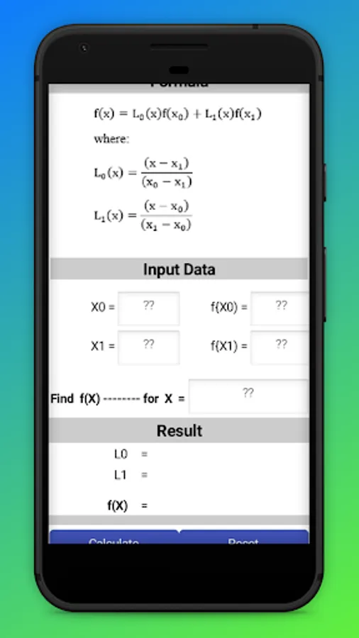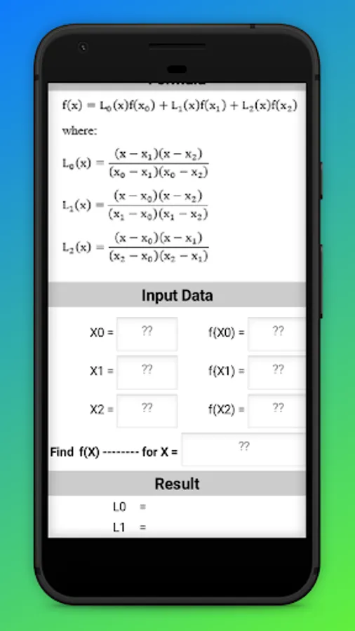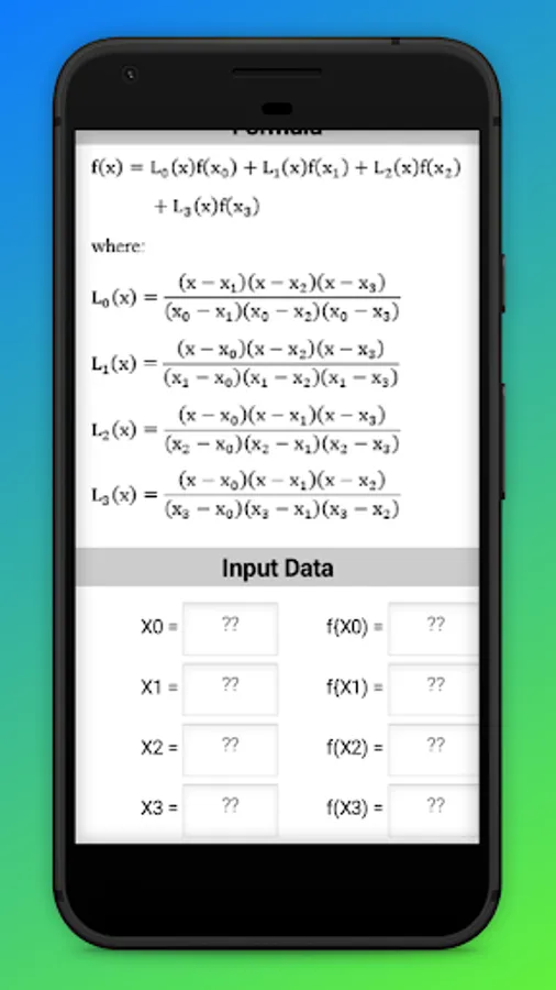 The program allows you to interpolate using Lagrange Interpolation Polynomial for Linear, Quadratic and Cubic Interpolation.