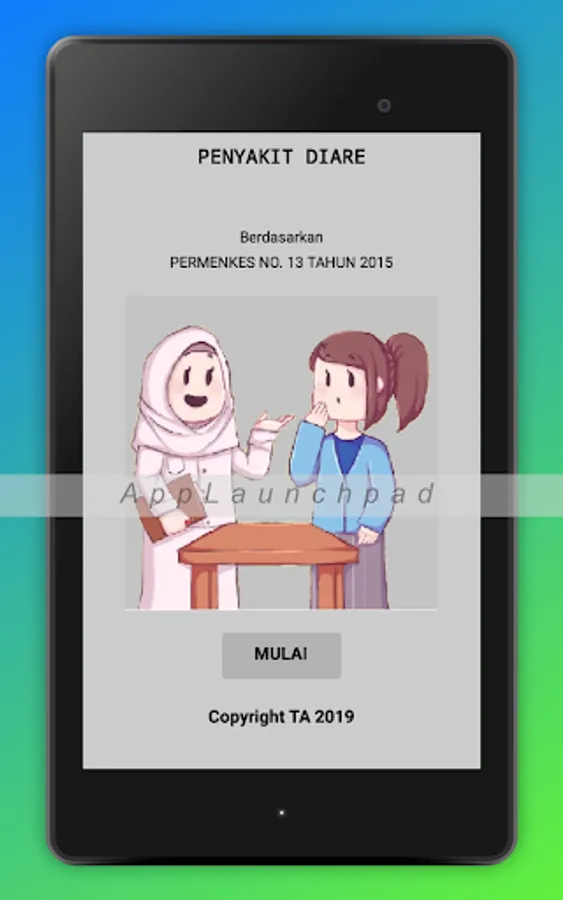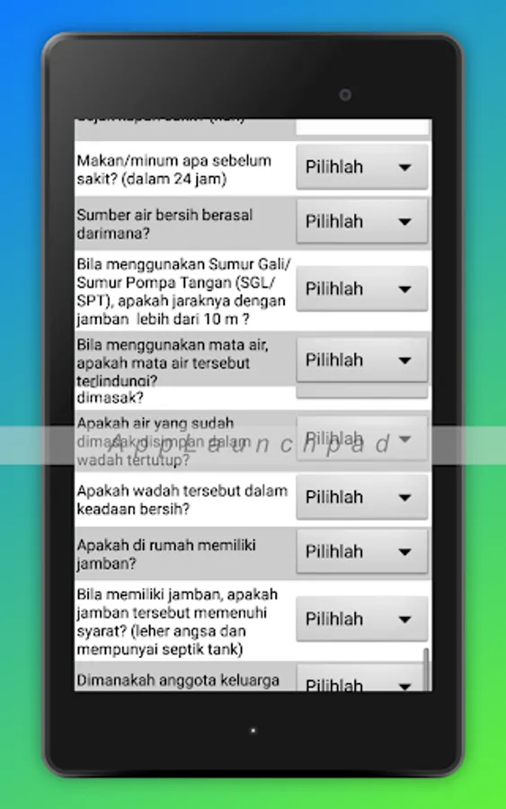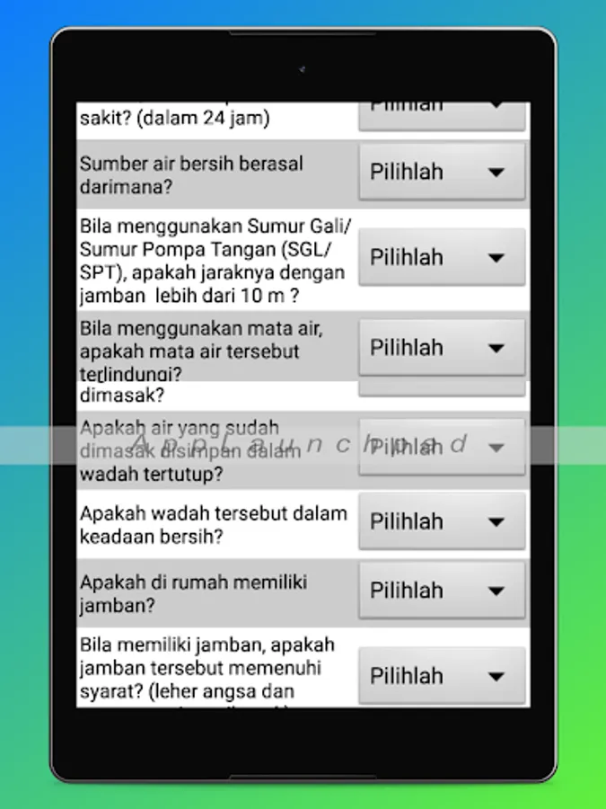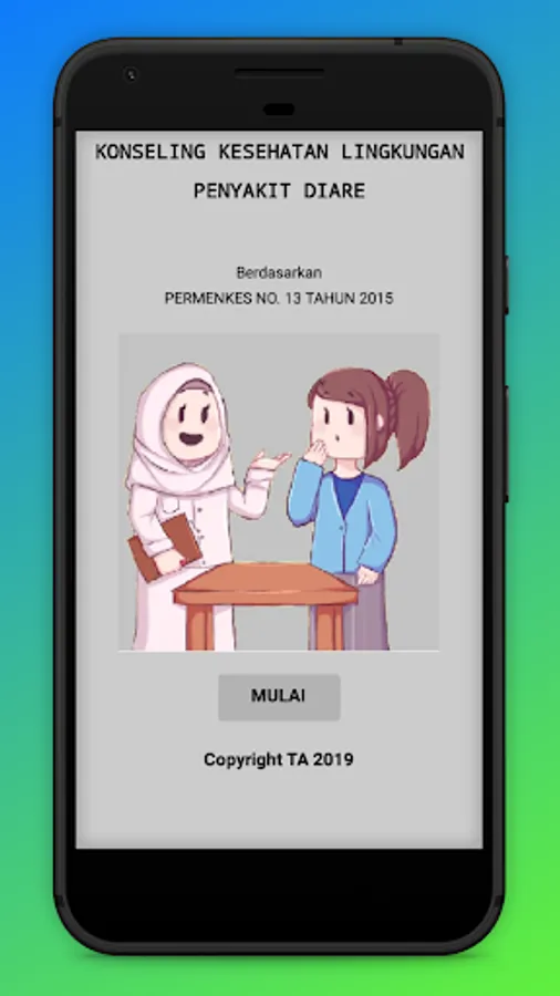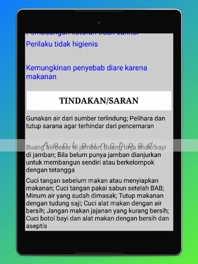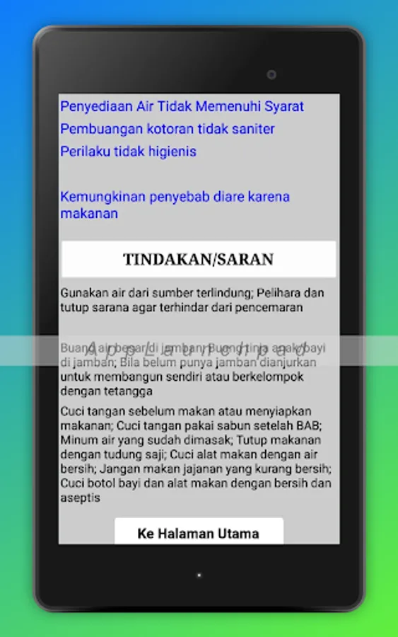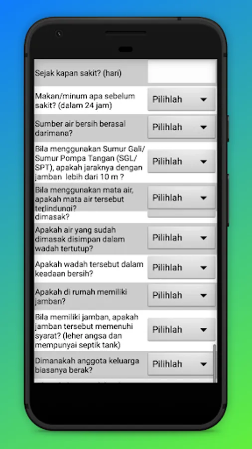 This application can be used to determine the cause of diarrhea through the identification of risk factors including food, bowel movements, behavior and sources of clean water and the environment. This application provides suggestions and input to make improvements to sanitation facilities and behavioral changes to overcome diarrheal diseases. This application can not only be used by health workers, but can also be used by health cadres and the general public. The reference for the application is Minister of Health Regulation No. 13 of 2015.