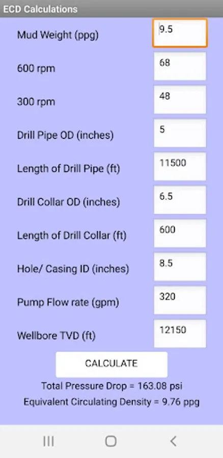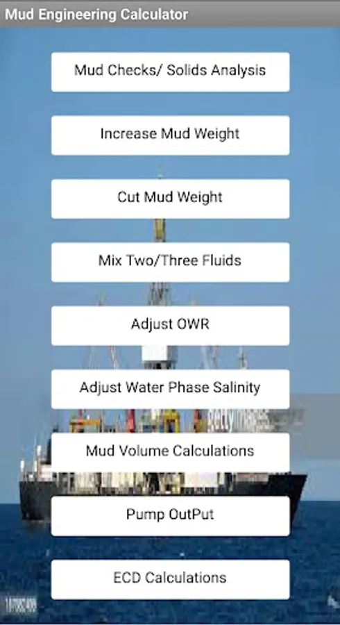 Mud Engineering Calculator is a drilling fluids program for performing mud engineering calculations. This tool is useful to Fluids Supervisors, Fluids Coordinators, Wellsite Mud Engineers, Cement Engineers and Laboratory Technicians. This app among others calculations, performs Mud Checks/ Solids Analysis for OBM/ SBM & WBM, Water Phase Salinity Adjustment, Oil-Water Ratio adjustment, Mud Weight Calculations, Mud Tank Capacity Calculations, Wellbore Volume Calculations and Pump Output Calculations. This program has been tested on different android devices.