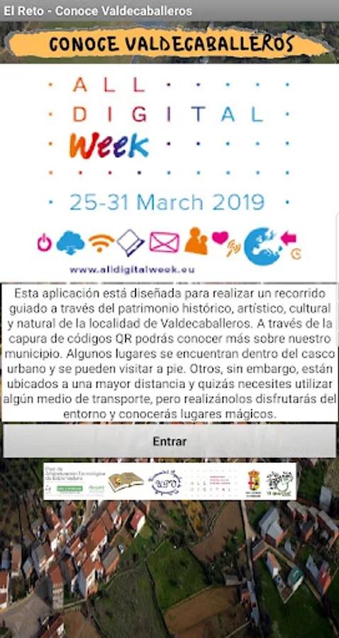 Application created by a group of NCC users of Valdecaballeros during the All Digital Week with the aim of promoting the municipality and its historical, cultural, folkloric and natural heritage. Through the capture of QR codes in the indicated points you can obtain 'extra' information to be able to overcome the All Digital Challenge.