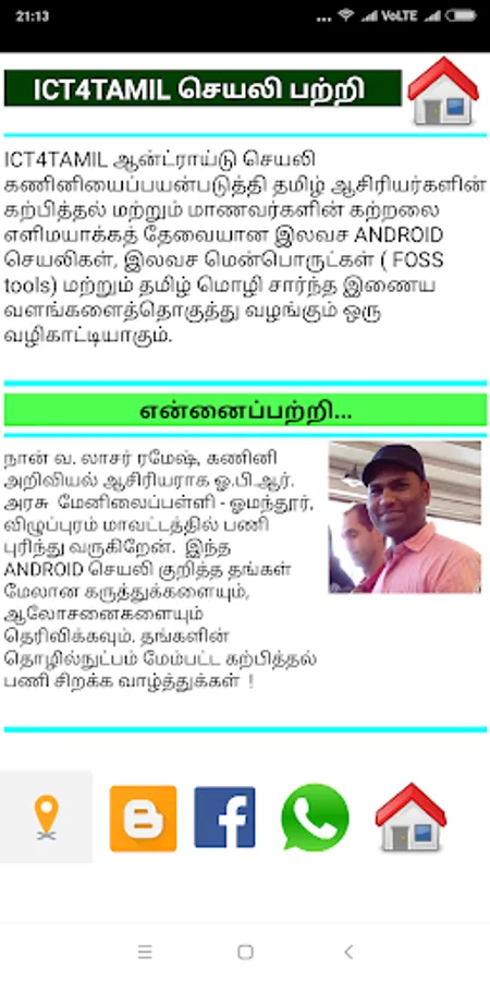 ICT4TAMIL என்னும் இந்த செயலி தமிழ் ஆசிரியர்கள் கணினி மற்றும் திறன் பேசி மூலம் கற்பித்தலை ஊக்குவிக்கத் தேவையான செயலிகள், இலவச மென்பொருட்கள் மற்றும் இணைய வளங்களைக் கொண்டுள்ளது. இவை மாணவர்களின் கற்றலை எளிமையாக்குவதுடன் இனிமையாக்கும்.