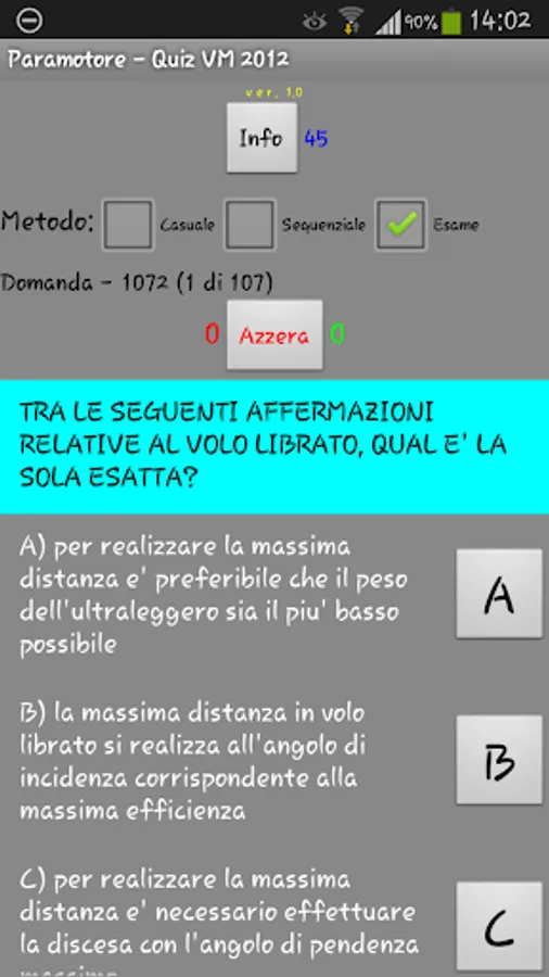 - TEST: 50 questions are asked according to the table in the info and a countdown of 45 minutes (the examination foresees 90).