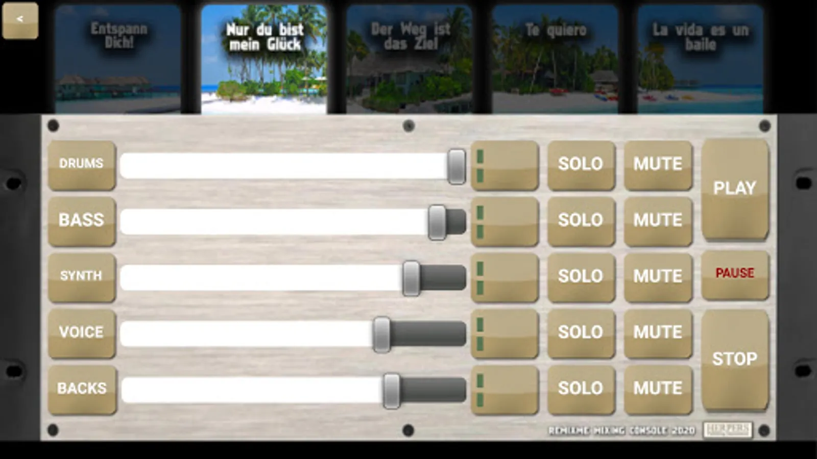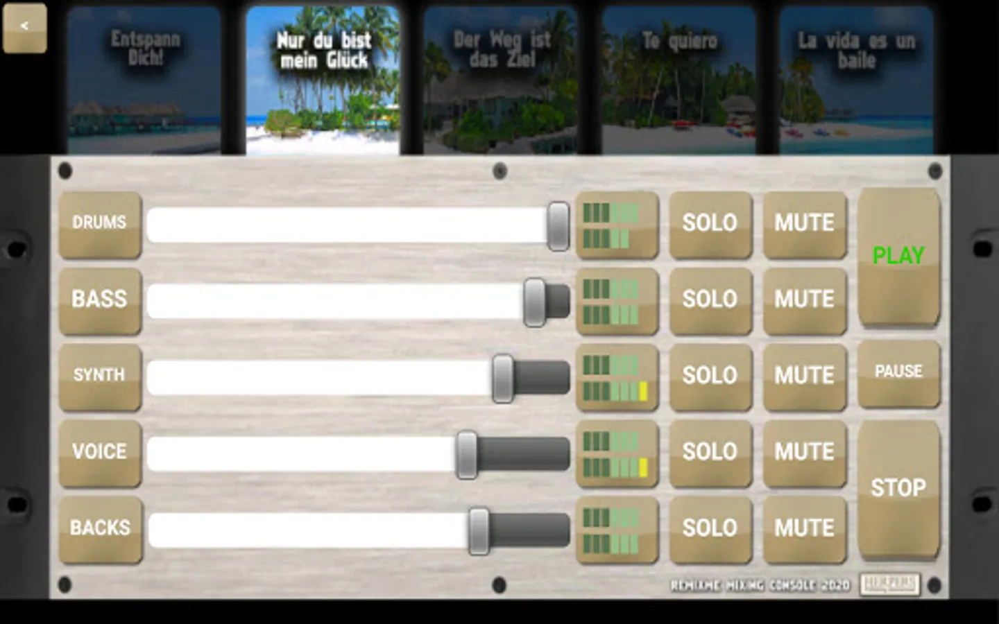 REMIXing a song has never been easier. You don't need any mixing or recording skills! Use the app alone or at a party. You can switch any of the 5 tracks on and off or change their volume.
