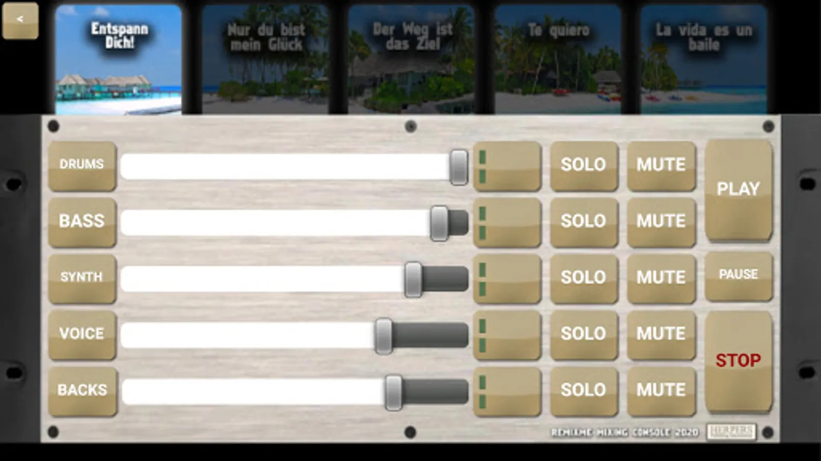 You don't need any mixing or recording skills! You can switch the drums, bass, instruments, lead and background vocals on and off or change their volume as you wish.