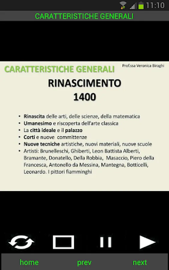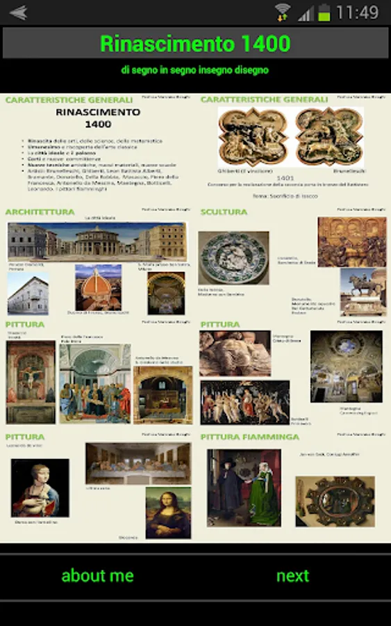 Multimedia course relating to the artistic period of the Renaissance in 1400. Images and audio explanations relating to the main aspects and works are proposed. The realization of the course was inspired for didactic purposes for the Art and Image course at the Quintino Di Vona First Grade Secondary School, Milan.