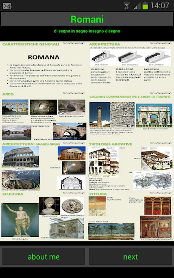 Multimedia course on Roman art. Images and audio explanations relating to the main aspects and works are proposed. The realization of the course was inspired for didactic purposes for the Art and Image course at the Quintino Di Vona First Grade Secondary School, Milan.