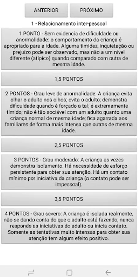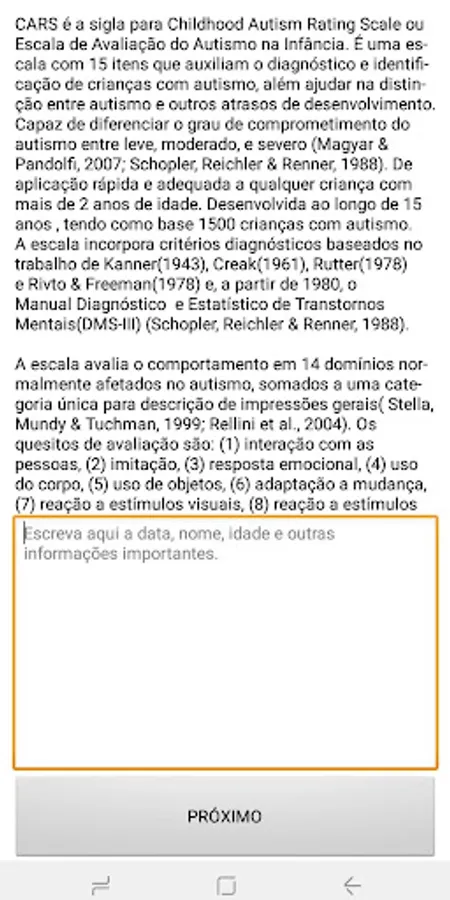 CARS stands for Childhood Autism Rating Scale or Childhood Autism Rating Scale. It is a scale with 15 items that help the diagnosis and identification of children with autism, besides helping to distinguish between autism and other developmental delays. Able to differentiate the degree of impairment of autism between mild, moderate, and severe (Magyar & Pandolfi, 2007; Schopler, Reichler & Renner, 1988). Quick and suitable for any child over 2 years of age. Developed over 15 years, based on 1500 children with autism. The scale incorporates diagnostic criteria based on the work of Kanner (1943), Creak (1961), Rutter (1978) and Rivto & Freeman (1978) and, since 1980, the Diagnostic and Statistical Manual of Mental Disorders (DMS-III) (Schopler, Reichler & Renner, 1988).