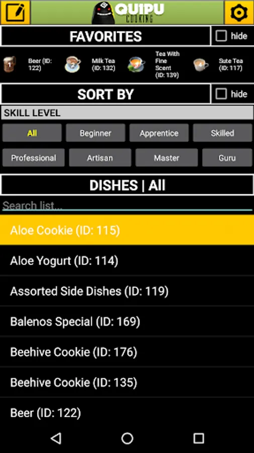 • Sort dishes according to cooking skill level, materials/ingredients (soon) and effects (soon)