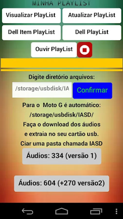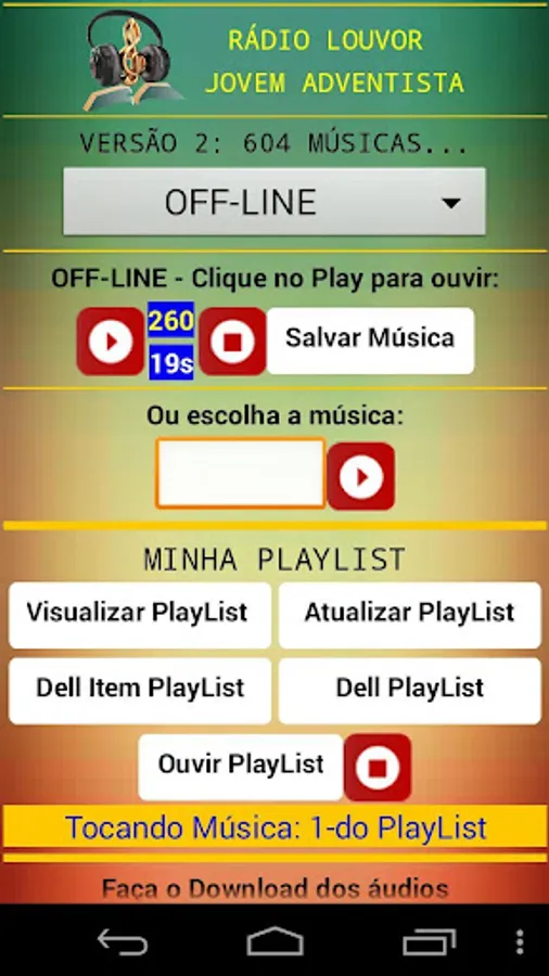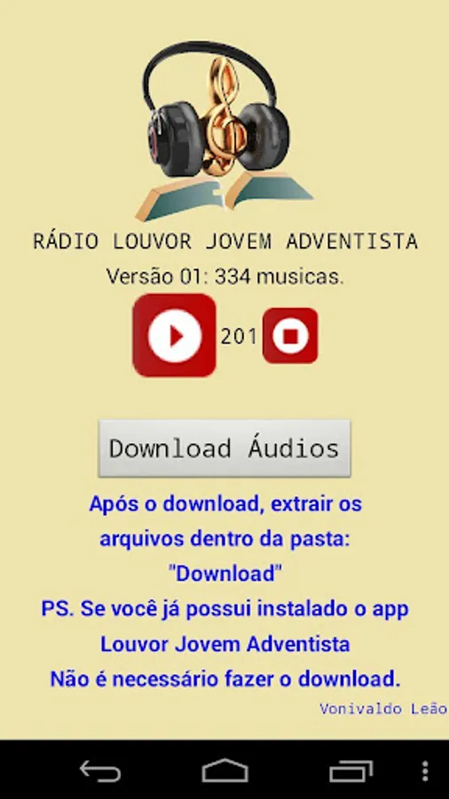 Music application "Radio" containing 604 songs Adventist Youth Praise app. This is an application for the user to listen to 604 songs already included in the app "Praise Adventist Youth" so offline, online and at sdcard or USB after downloading the audio. The user has the option to install it and make downloads of audio even if you do not have the app "Praise Adventist Youth" installed on your machine. This is the version number 07. The objective of this radio is to gradually increase the number of songs and the goal is to reach 1,000 songs up to version 10, independent of the 604 songs present in the Adventist Youth Praise app. The songs in this first release are those in cd's JA 1992-2016, two albums of Daniel Ludke, Worshipers, Ministry of Praise and Heralds of the King and several other most heard songs. When you download the audio, you must extract the files in the "Download" folder of your device, or if you prefer to create an SDA folder on sdcard or USB stick (you can create a folder and name as you like, as long as the correct entry path where the audio files to the proper functioning of the application. God bless praise Him forever.