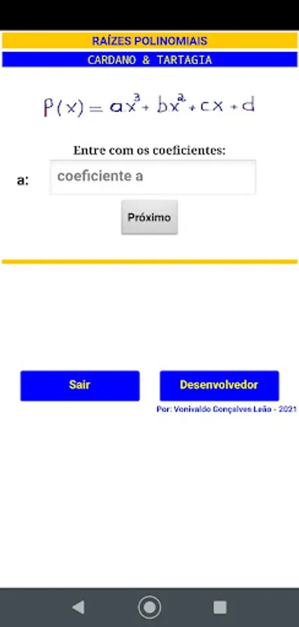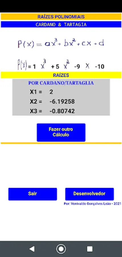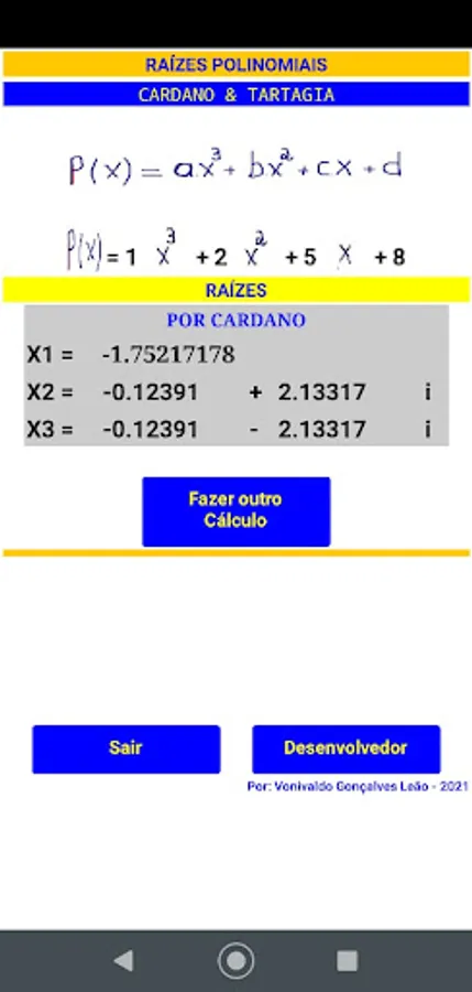 Application based on the determination of third degree polynomial roots by the methods of CARDANO and TARTAGLIA, providing real and complex roots.