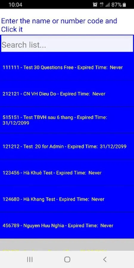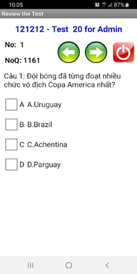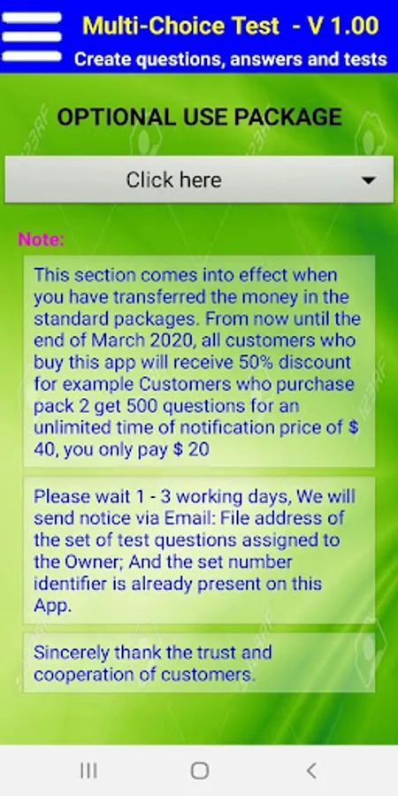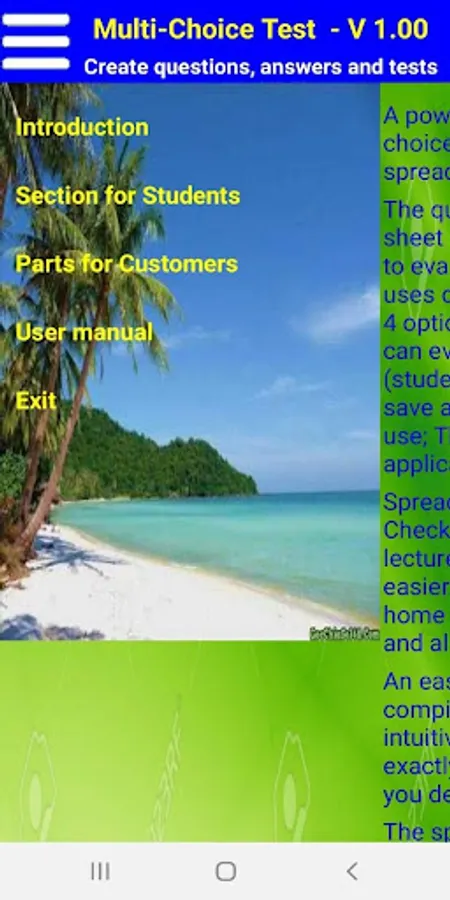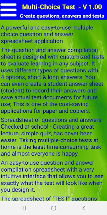 Multi-choice test, The spreadsheet of "TEST" questions and answers is very small, does not affect the internal memory of the phone, so it must be confirmed that: