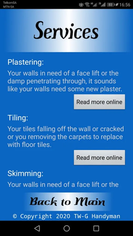 We are a handyman service offering tiling, paving, plastering, skimming, painting, ceilings and waterproofing for commercial and private residents in and around Cape Town.
