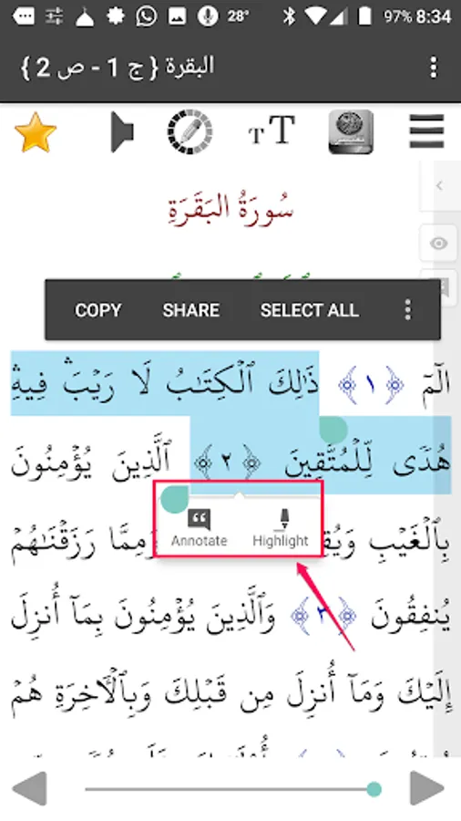 * إمكانية نسخ ولصق نصوص القرآن الكريم مع الحركات ونصوص التفسير ومشاركته في برامج التواصل الاجتماعي او البرامج الاخرى.