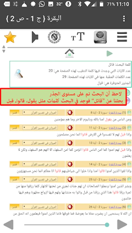 * البحث عن عبارة أو كلمة داخل القرآن الكريم وتفسير الايات المحتوية على تلك الكلمة بتفاسير متعددة