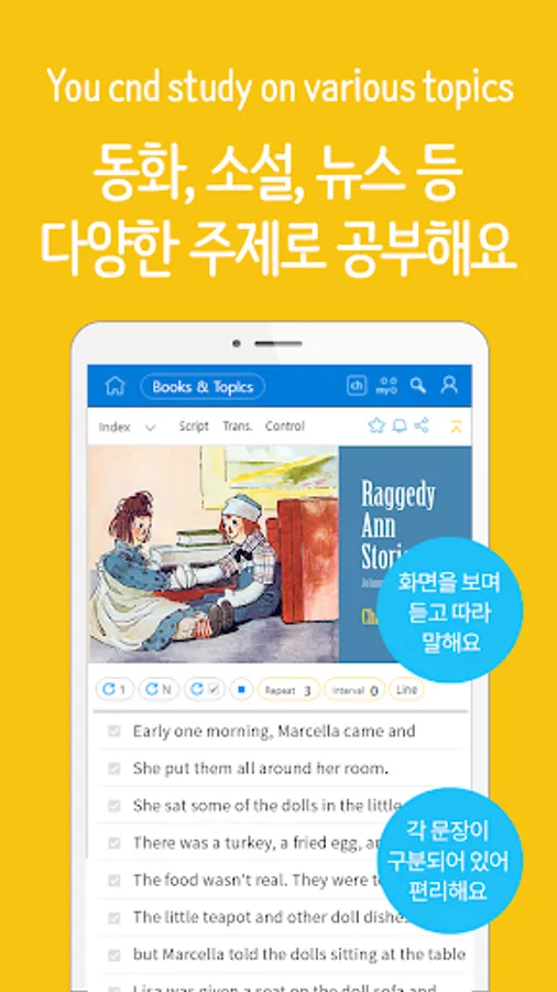 With Whocan Talk, you can listen to each sentence in sequence with a single click or listen to only inaudible sentences indefinitely, allowing the language to be embodied in the body. This function helps students to study conveniently without button manipulation in a car commuting to and from school, a bus, or a train.