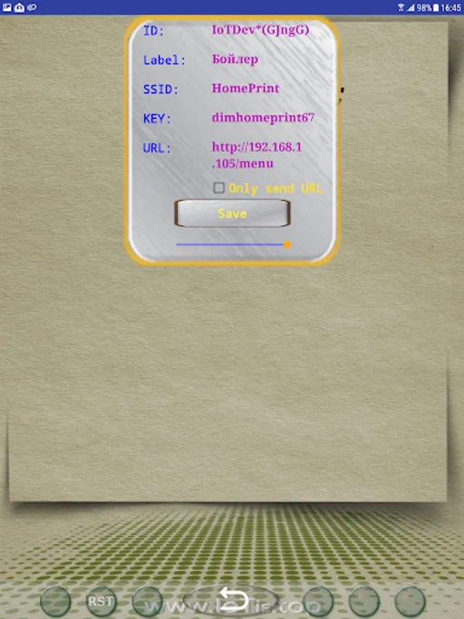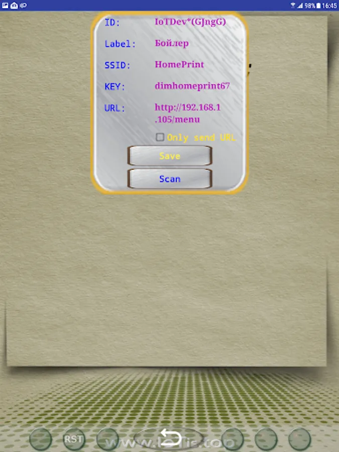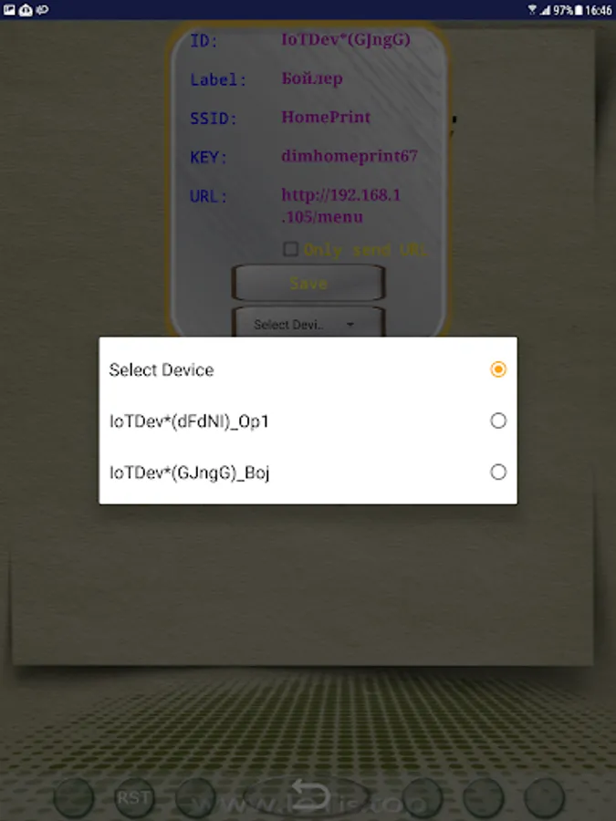 The application allows connecting to a selected WiFi local network, finding IoT devices and creating control buttons for communication. In order to be recognized, IoT devices must respond to a query / readID with the following data: (identifier), (additional label or _), (Password), (& IP), (m / menu, a / swON, a / swOFF). The last brackets contain the possible queries and commands for the given device - with m / start the queries that will be opened in a browser, and with a / - commands executed without the need to open in a browser. An example lamp control code can be found at: https://iotis.top/, in "Lamp Management Project".