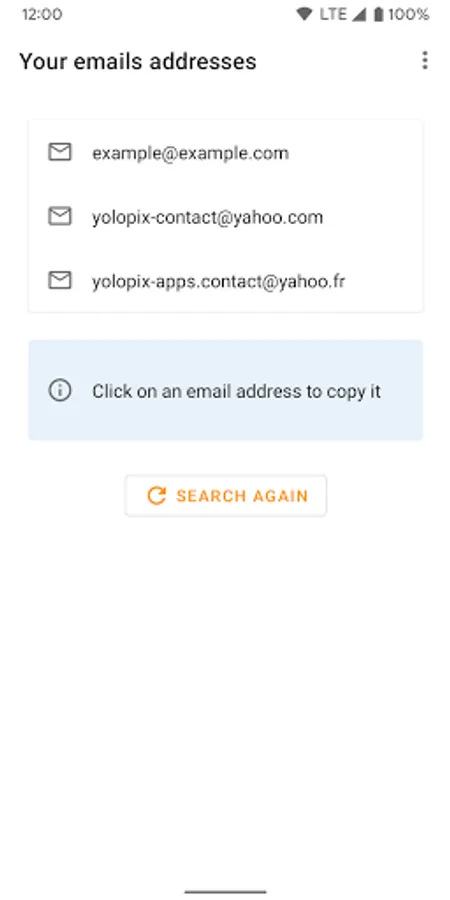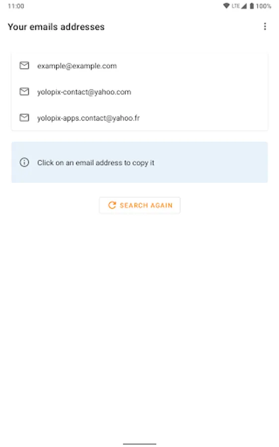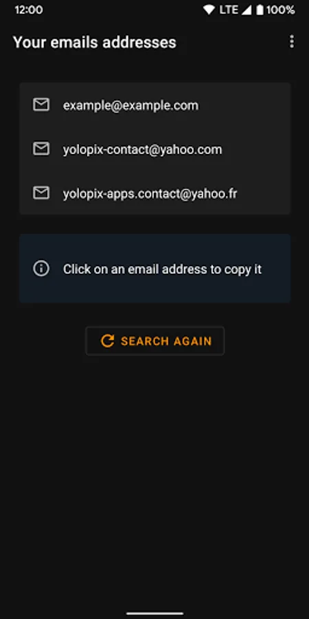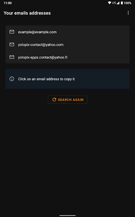 This tool is designed to be simple. Just open the application to directly get the list of email addresses and click on an email address to copy it to the clipboard.