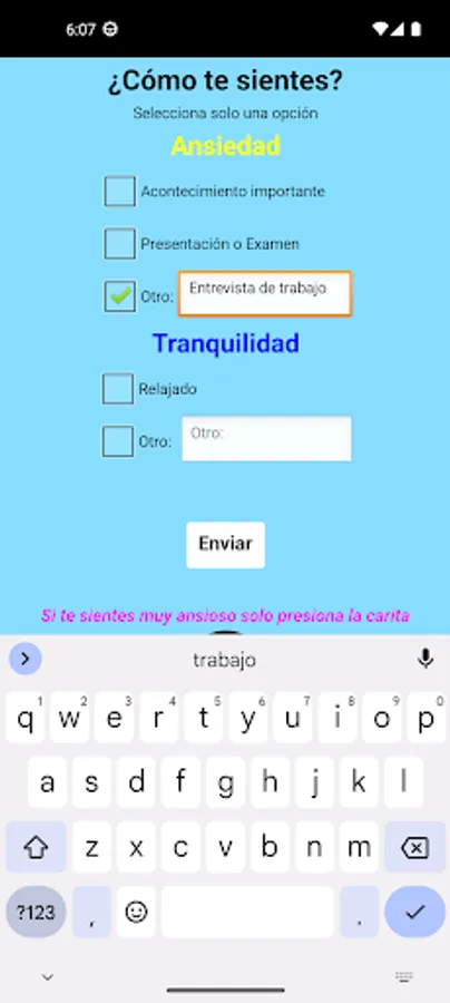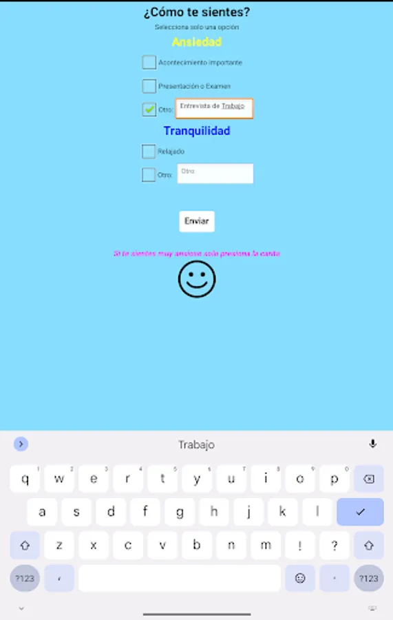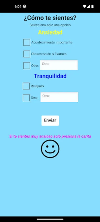 En esta app podrás almacenar tus datos de cuando sientes ansiedad para que posteriormente sean analizados, complementandolos enviando tus registros biometricos medidos por una smartband.