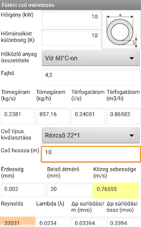 Design of heating or cooling piping based on the input heat quantity, temperature difference, and the type and size and length of the pipework. The application includes the dimensions and surface roughness of the base tube types as well as the density and viscosity of the selected thermal fluid. The end result is a "meter water column" [mvo], which can be used to calculate the required pumping performance.