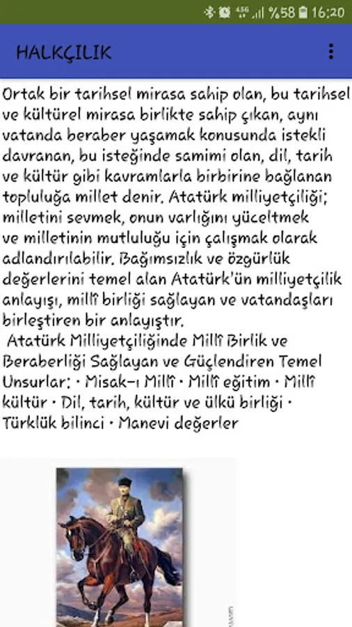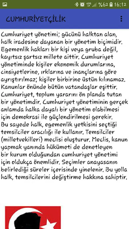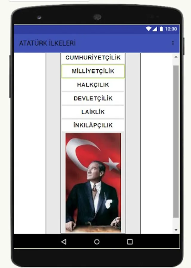 Atatürk İlkeleri adlı uygulamamızı Ömür Ali Şan isimli öğrencimiz hazırlamıştır. Bölüm butonlarına basarak ilkeler hakkında bilgi sahibi olabilirsiniz, geri dönüşler için en altta bulunan Anasayfa butonlarını kullanınız.