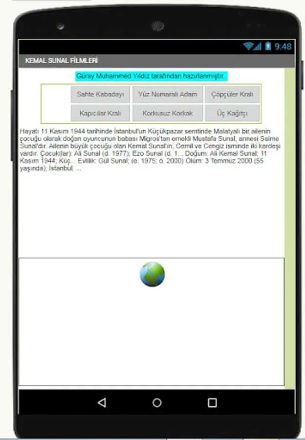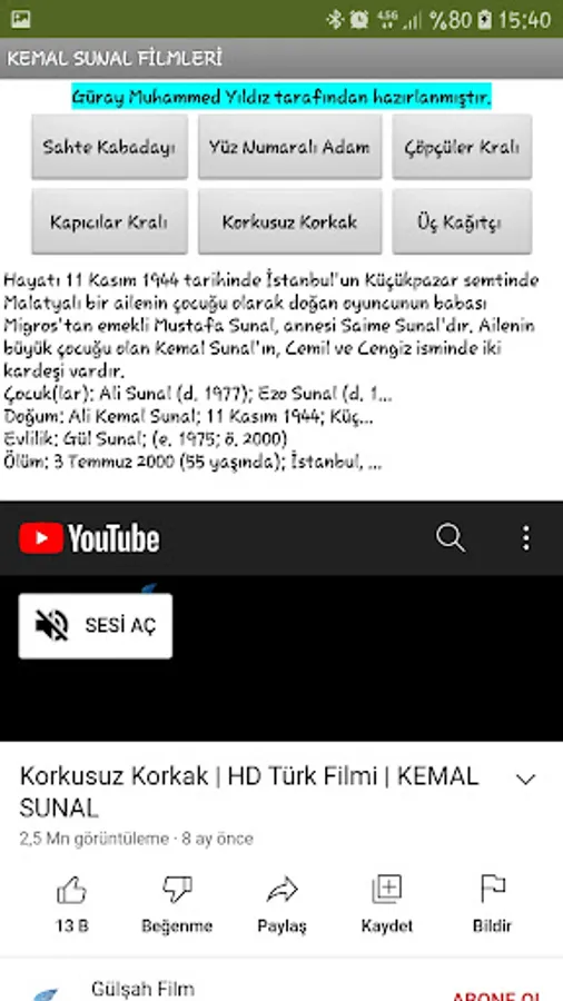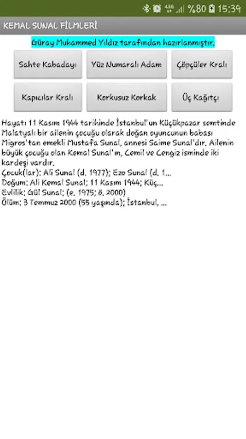 The purpose of our application is to try to bring together the films of Kemal Sunal, which we love very much, with more people. We chose 6 movies and provided them to watch by giving youtube links through our application. enjoy watching