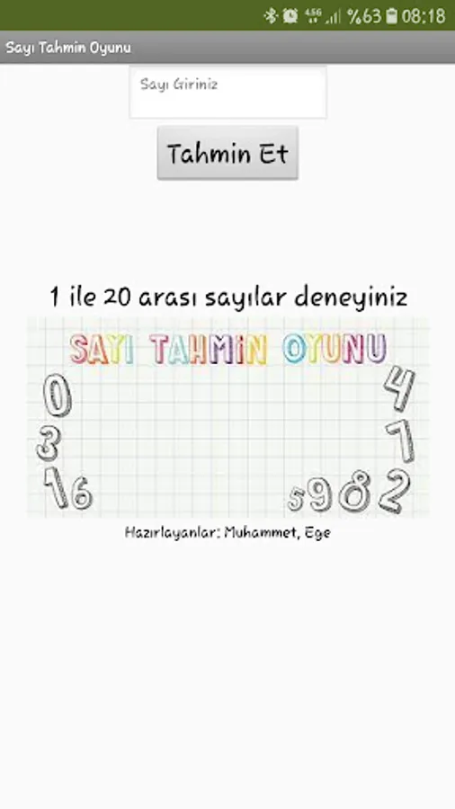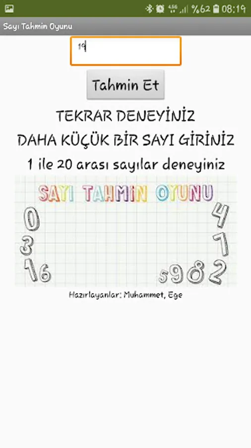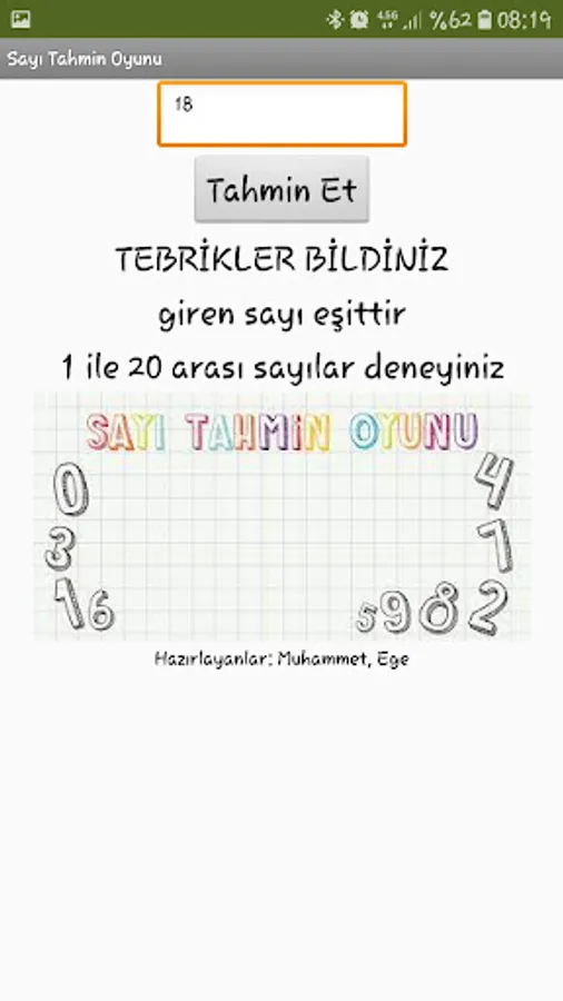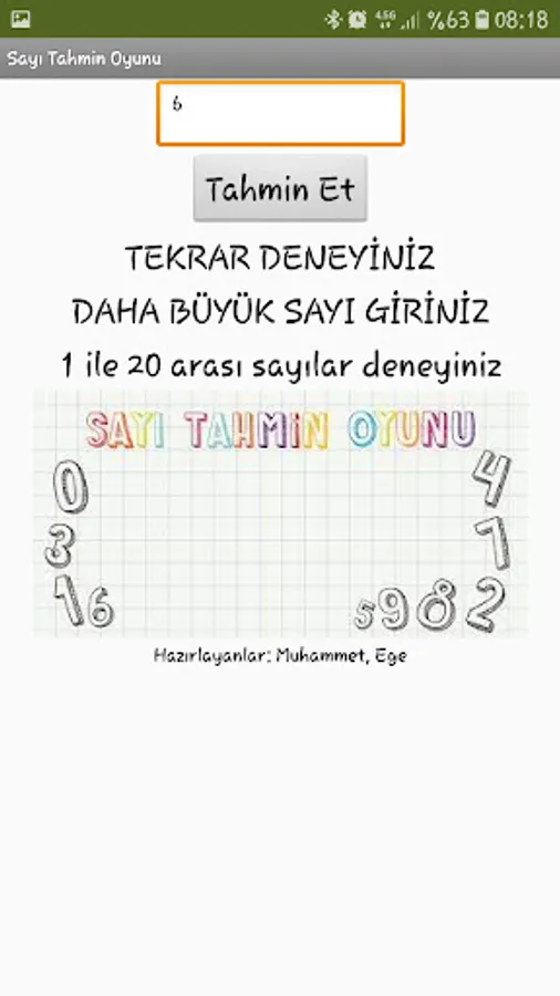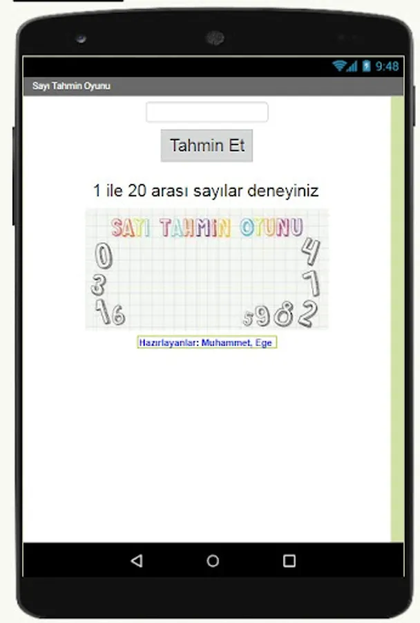 We try to guess numbers from 1 to 20 in the game application prepared by Muhammed and Ege. When we enter large and small numbers, it guides us with feedback, so we find the right number. I congratulate my students for their work, which is a very good example of teamwork.