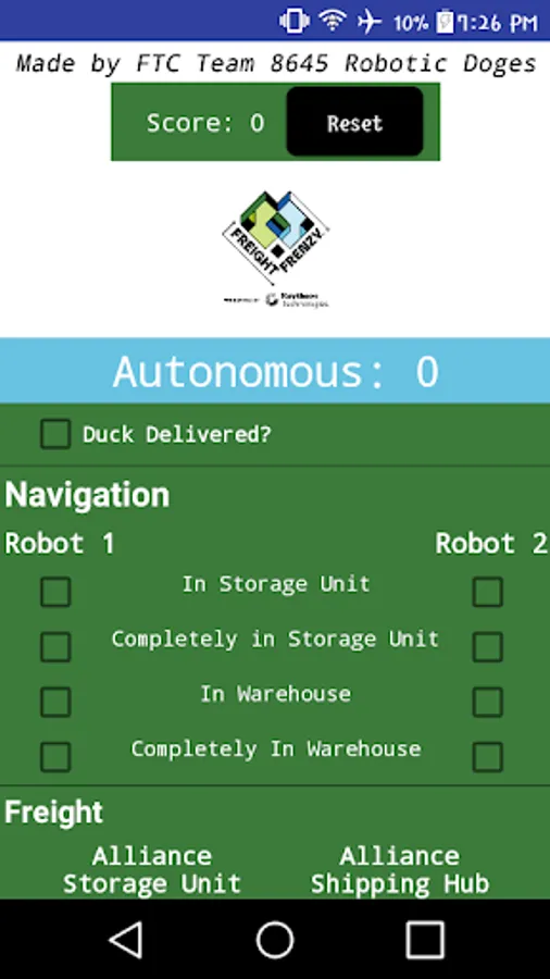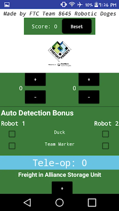 The app scores one robot, or an entire alliance! Created in MIT App Inventor 2 by FTC Team 8645 - Robotic Doges. Follow us on Facebook, Instagram, and Twitter @ftcteam8645.