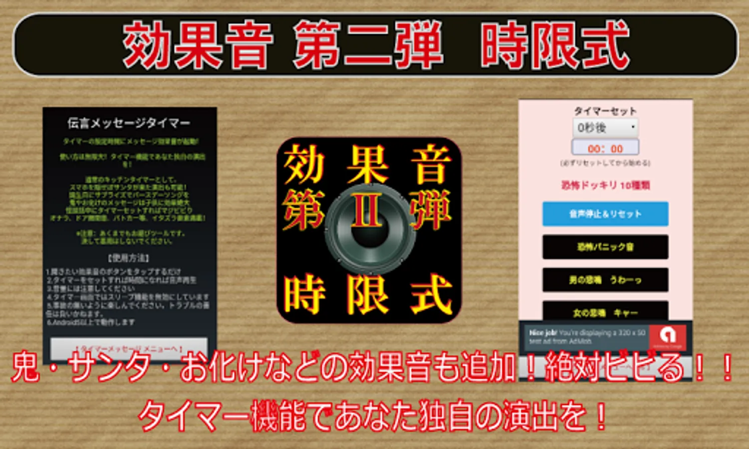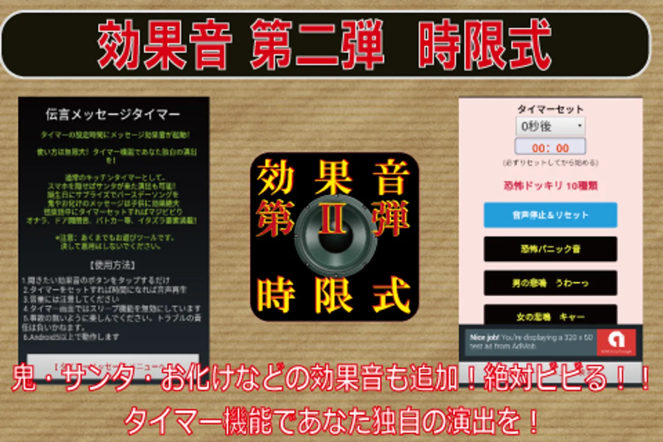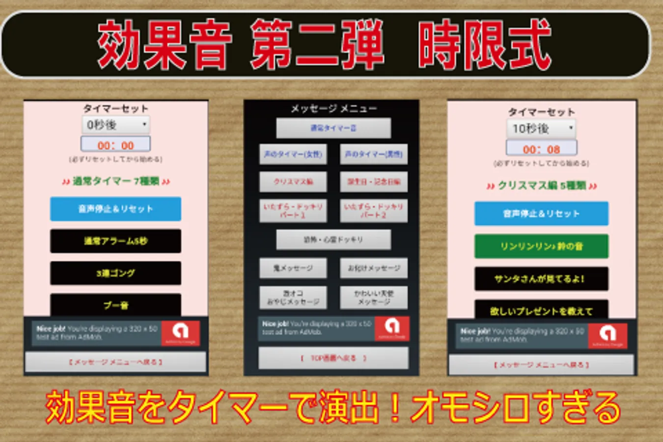 ジャンル別に用意された「効果音」や「伝言メッセージ」をタイマーの設定時間に再生するアプリです。