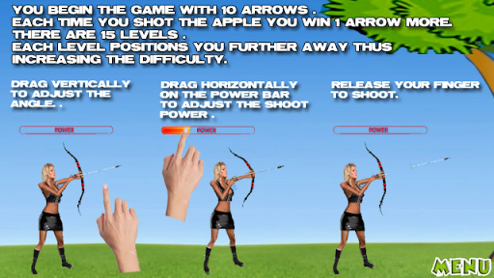 You begin the game with 10 arrows . Each time you shoot the apple you win 1 arrow more. There are 15 levels . Each level positions you further away thus increasing the difficulty.