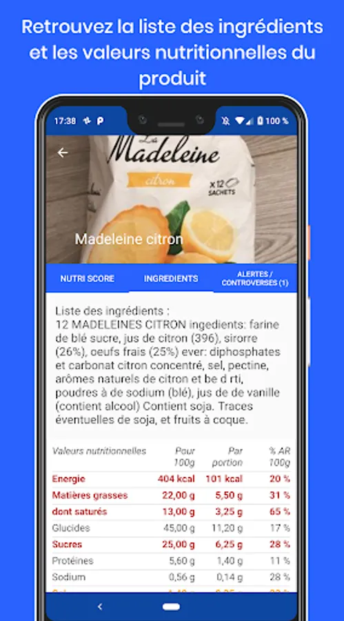 You will also find for each product, in addition to Nutri-Score and NOVA, alerts concerning the content of fats, sugars and salt. You will also find the complete composition of the product with the indication concerning the daily contributions that it represents.
