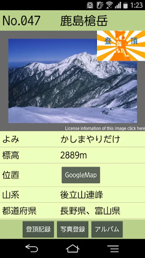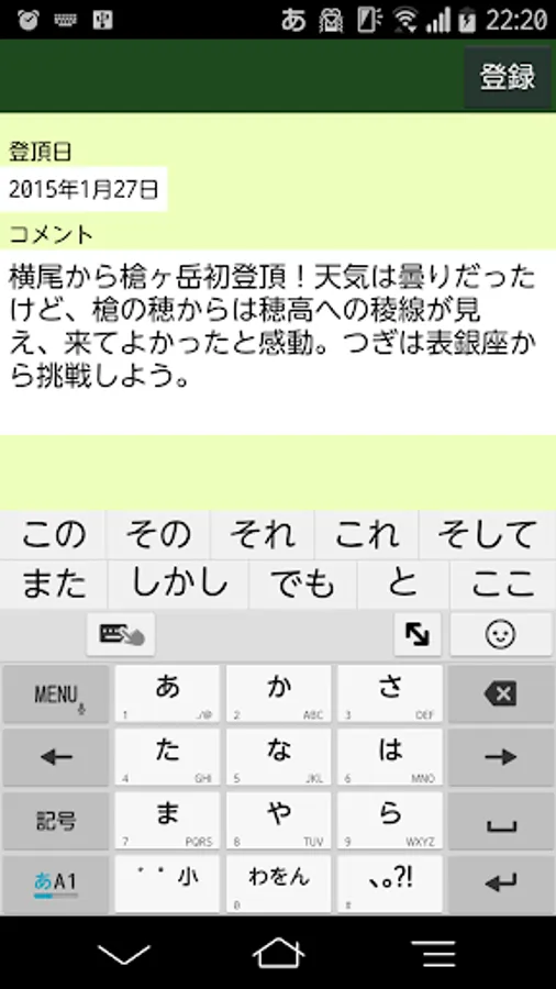 ・詳細画面では山に対して登頂登録、写真登録、登頂日とコメントの登頂記録ができます。