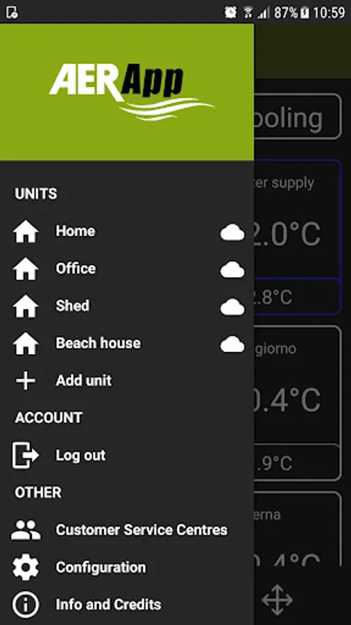 AerApp can be installed and started up on more than one terminal, and the user can log in with his/her credentials on different terminals. The systems connected to the user's AERMEC cloud will be available on all the logged terminals.