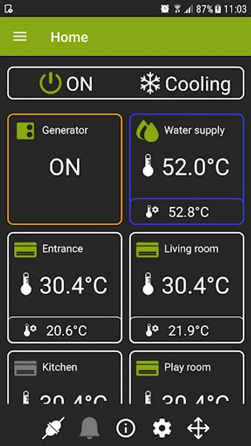 For each single system controlled, you can see the status (ON/OFF, heating/cooling mode) and the operation of the various elements: domestic hot water storage tank, heat pump, fan coil areas. Any active alarms are also shown, and you can see the details of such alarms as well.