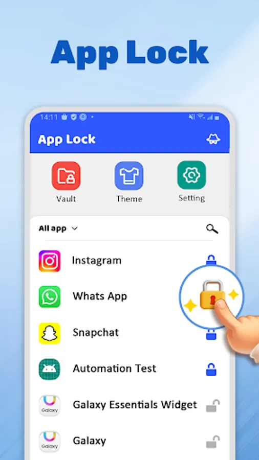 AppLock can lock Facebook, WhatsApp, Gallery, Messenger, Snapchat, Instagram, SMS, Contacts, Gmail, Settings, incoming calls and any app you choose. Prevent unauthorized access and guard privacy. Ensure security.