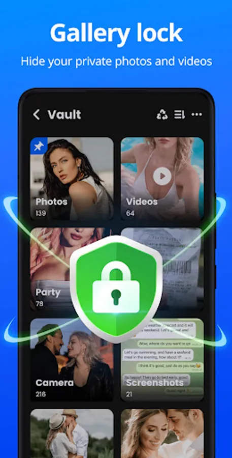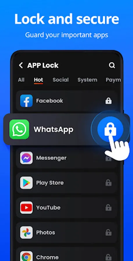 App Lock, easily lock apps and protect your private data with one click. Guard your phone with PIN, pattern or fingerprint.