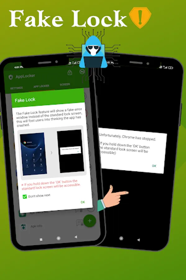 Fake Lock: App Locker includes a fake lock feature that creates a fake screen to trick anyone trying to access your locked apps.